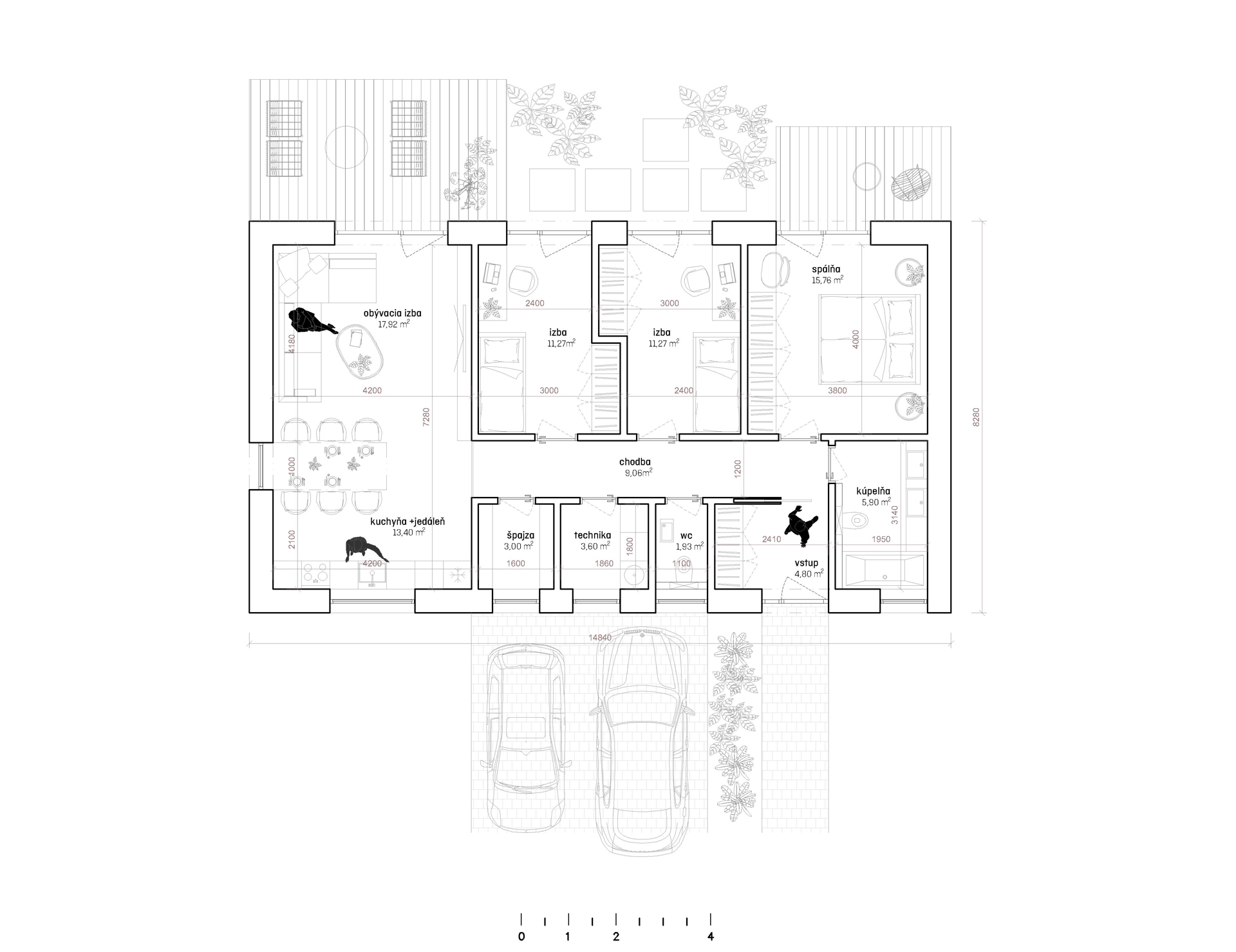 Rodinný dům Jelša nabízí jednoduchou a funkční dispozici pro moderní bydlení. Prostorná vstupní hala se šatníkovou skříní plynule přechází do centrální chodby, která efektivně propojuje všechny místnosti. Srdcem domu je otevřený denní prostor, kde se harmonicky spojuje obývací pokoj, jídelna a kuchyně. Kuchyně je navíc prosvětlena oknem s výhledem na vstup do pozemku.