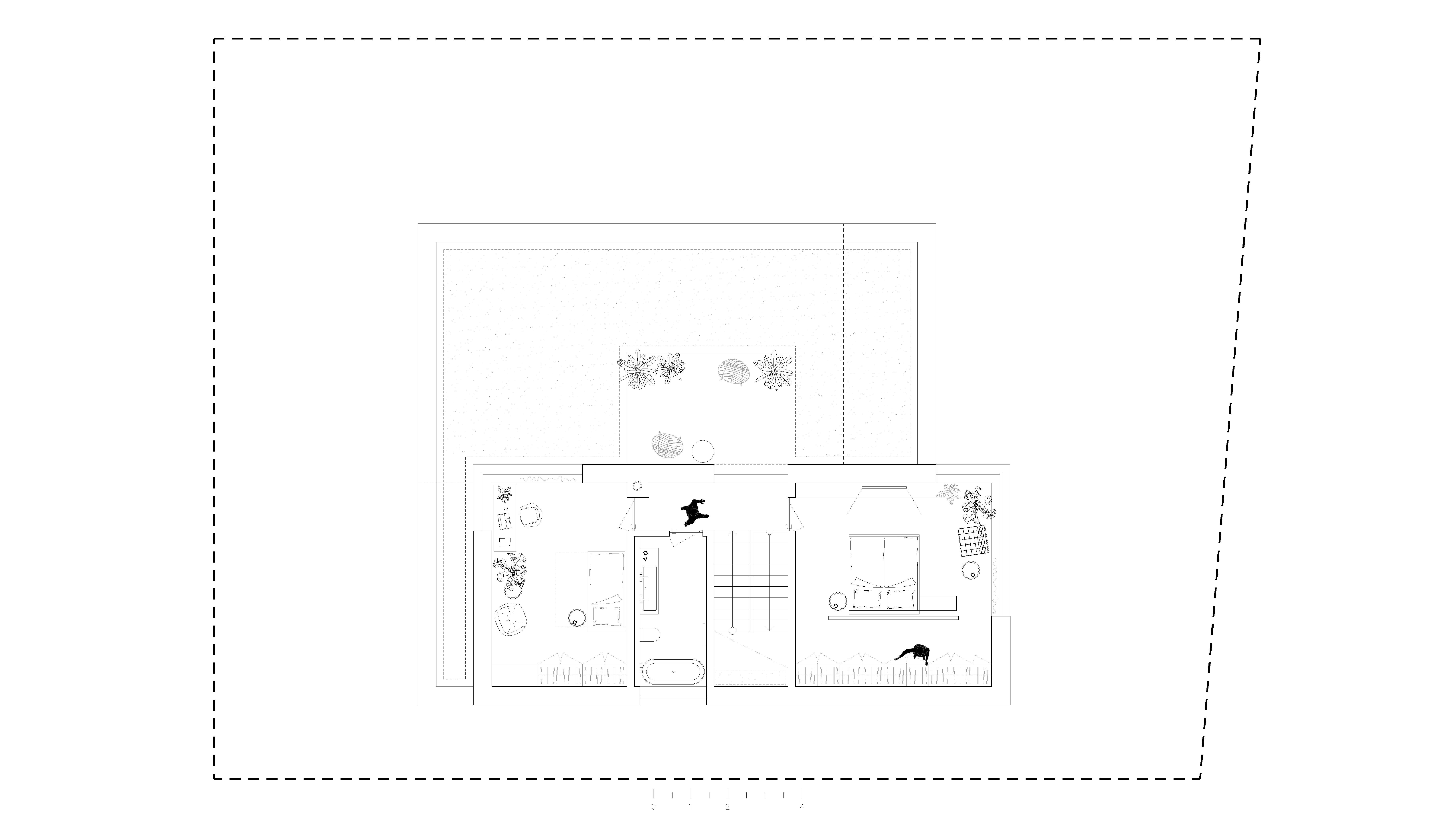 Přes schodiště se dostaneme na druhé nadzemní podlaží. Z chodby se otevírají jednotlivé pokoje a zároveň i terasa na střeše. Na severní stranu je orientována ložnice se šatníkem. Ve středu půdorysu se nachází koupelna. Prostorný dětský pokoj je orientován směrem na západ.