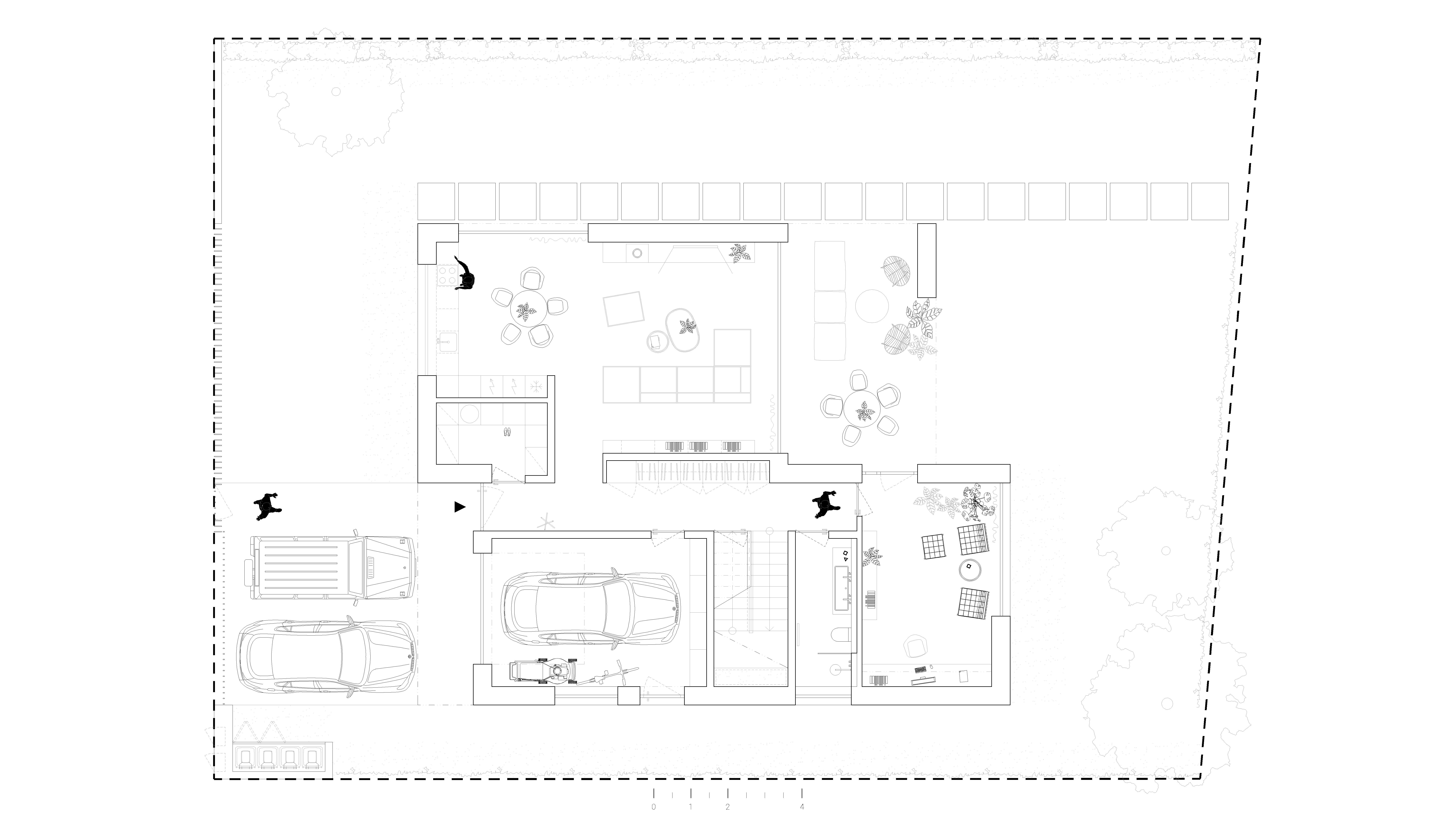 Hlavní vstup do domu je situován z jižní strany. U vstupu se nachází prostorný šatník sloužící zároveň i jako technická místnost. Z chodby se na pravé straně otevírá garáž se skladem, spíž, schodiště, koupelna a pracovna orientovaná směrem do zahrady. Z chodby se dále na pravou stranu otevírá denní zóna domu. Kuchyně, jídelna a obývací pokoj tvoří jeden celek a jsou orientovány na tři světové strany. Z obývacího pokoje se otevírá prostorná krytá terasa orientovaná na sever a západ.