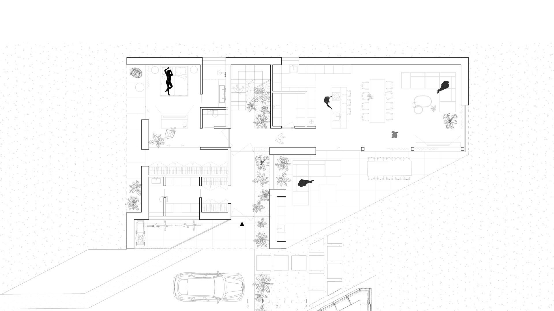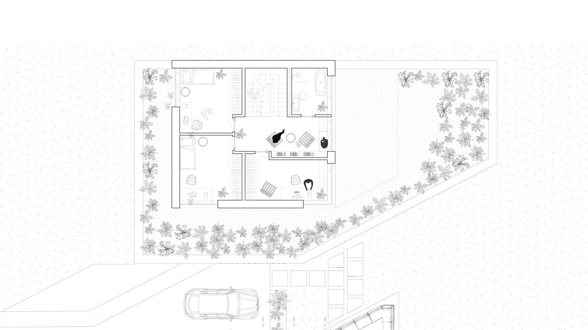 Hlavní vstup do domu je situován na jižní straně fasády. Zeleň která přechází z exteriéru do interiéru přes vstupní prostory až ke schodišti přirozeně propojuje zahradu s interiérem domu. Z chodby pomocí pivotových dveří se můžeme dostat do ložnicového apartmánu s velkým proskleným šatníkem a komfortní koupelnou. Denní zóna je dostatečně prostorná pro komfortní každodenní bydlení, ale i větší rodinné oslavy. Pomocí velkých otevíravých prosklení je možné denní zónu plynule propojit s velkou terasou a zahradou.