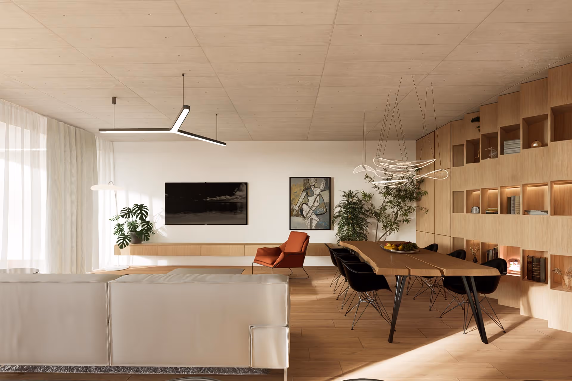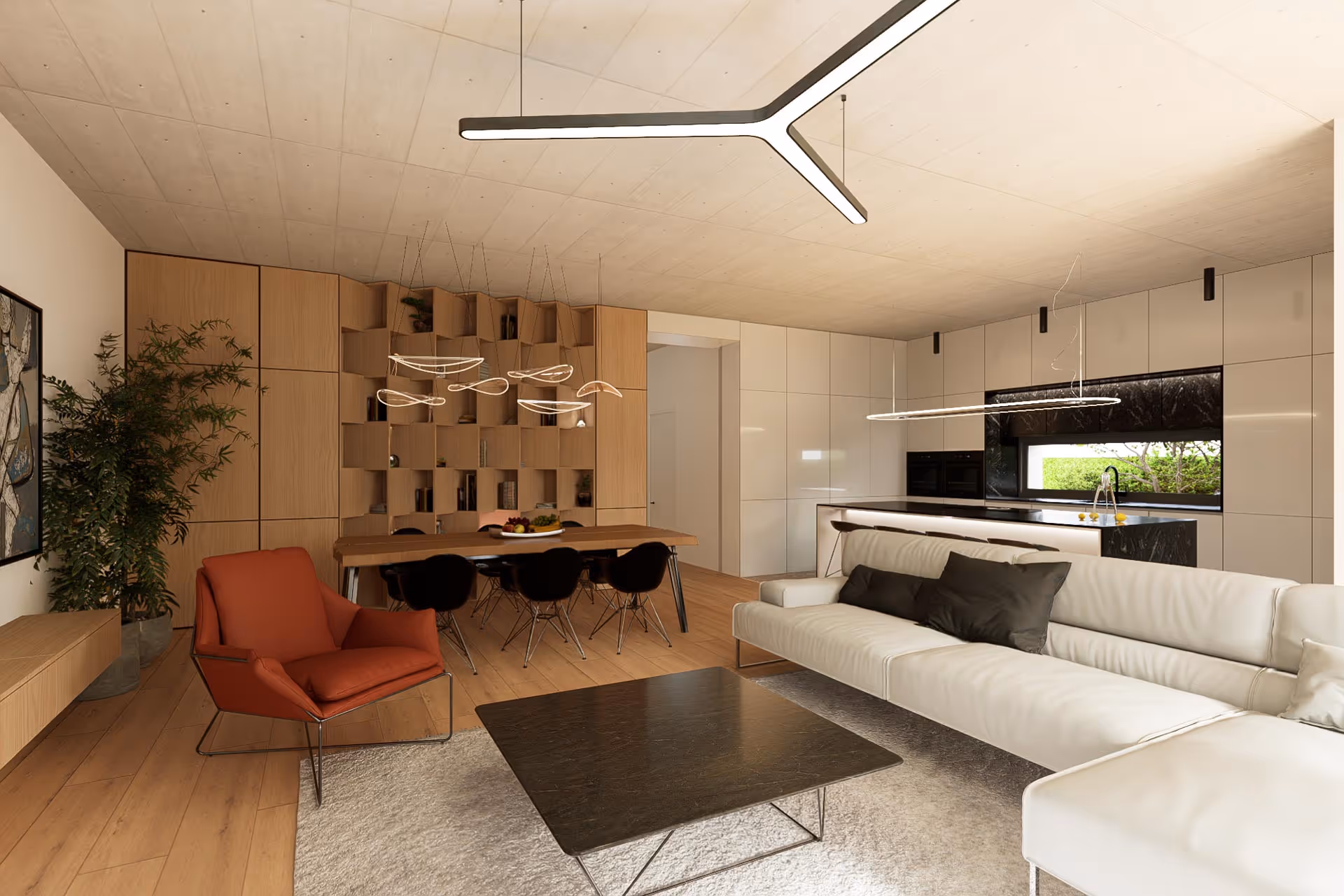 Navrhneme ideální uspořádání nábytku, funkčních zón a koncepce stylu (barevné schéma, materiály, náladové desky).