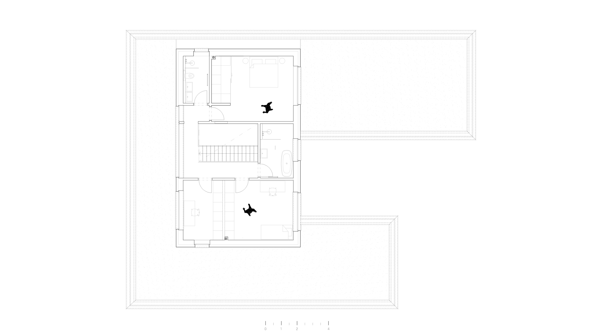 Přes konzolové schodiště se dostaneme na 2. NP, kde se nachází noční zóna domu. V pravé části půdorysu 2.NP se nachází dětský pokoj a pracovna. Ve středním traktu se nachází chodba, schodiště a koupelna. V pravé části půdorysu se nachází hlavní ložnicový apartmán s vlastním šatníkem a koupelnou. Obytné místnosti jsou orientovány na západní stranu směrem do zahrady.