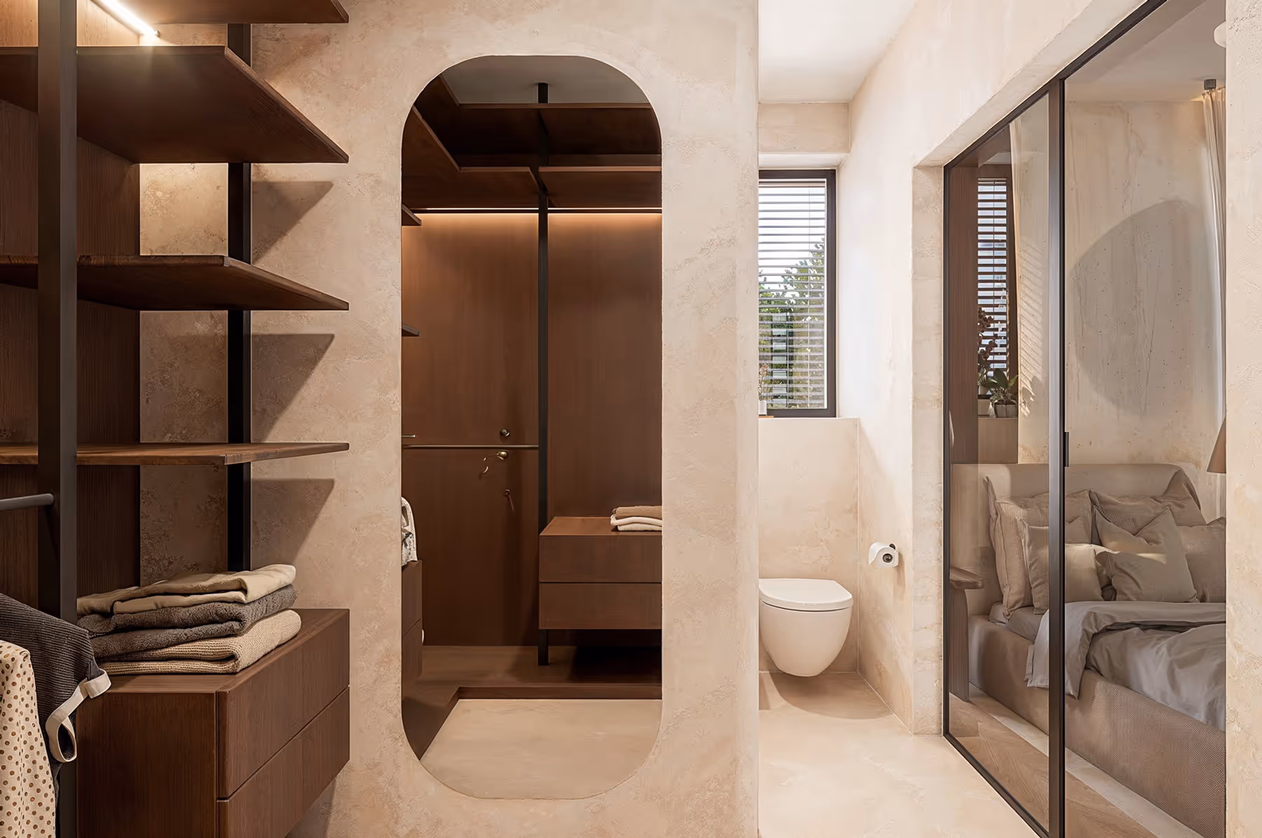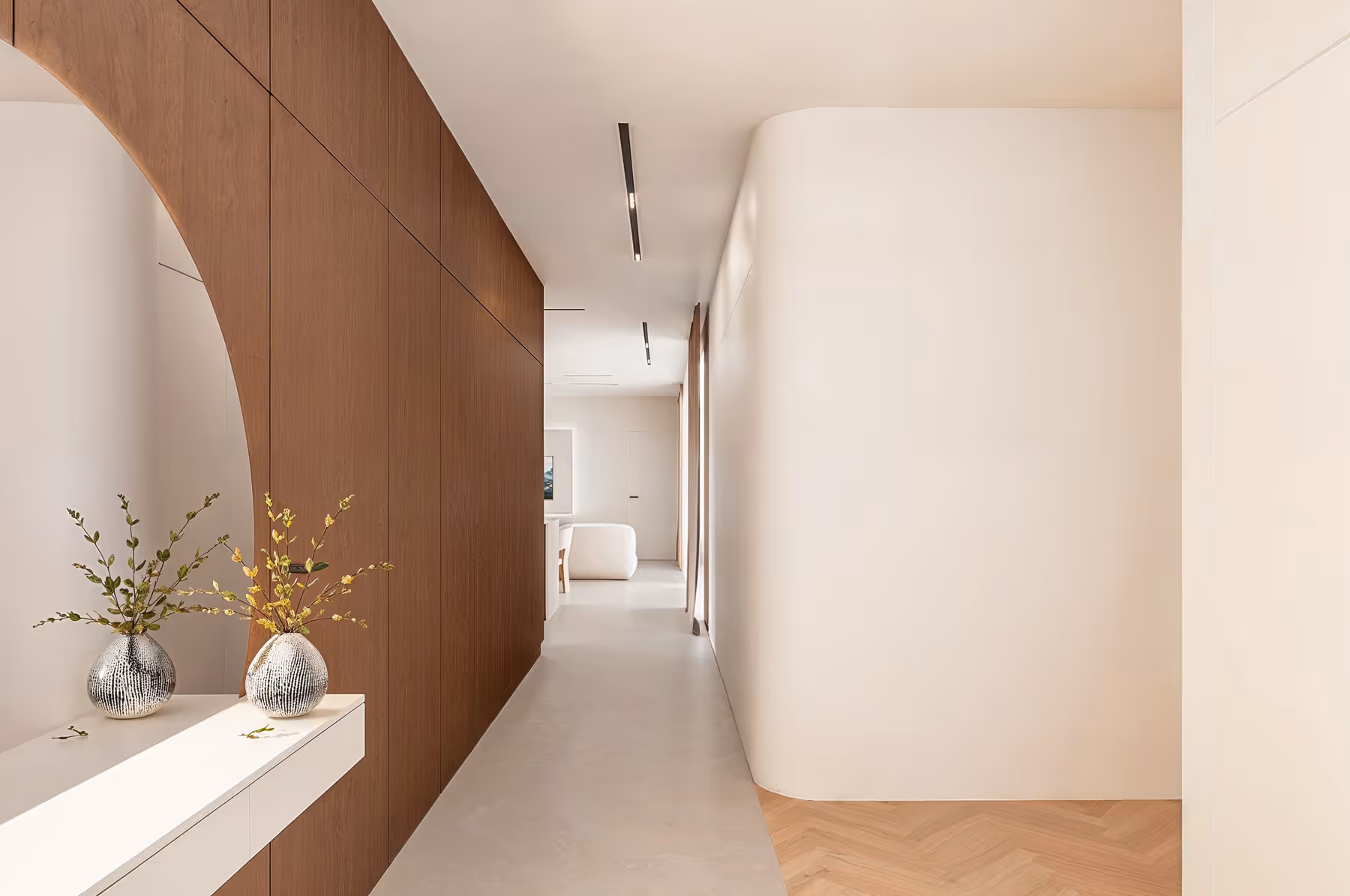 Moderný interiér sa nesie v duchu jemných oblých tvarov, ktoré priestoru dodávajú mäkkosť a plynulosť. Charakteristický je kontrast medzi tmavšou drevenou dyhou a svetlými detailmi na textíliách a stenách, čo vytvára vyvážený a vizuálne príťažlivý priestor plný elegancie.