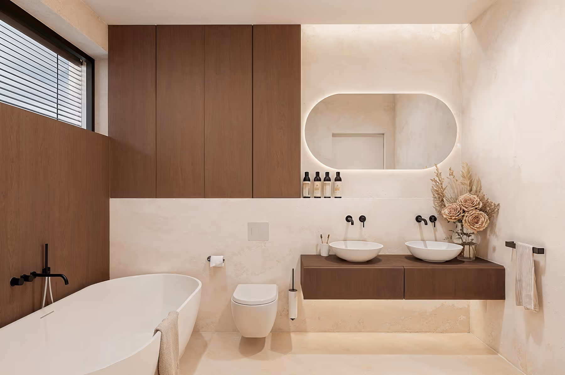 Konečný dojem z interiéru podčiarkuje prepracovaná harmónia tvarov, materiálov a farebných kontrastov. Oblé línie v kombinácii s tmavšou drevenou dyhou a svetlými detailmi prinášajú do priestoru rovnováhu, jemnosť a nadčasovú eleganciu, ktorá definuje moderný, premyslene navrhnutý domov.