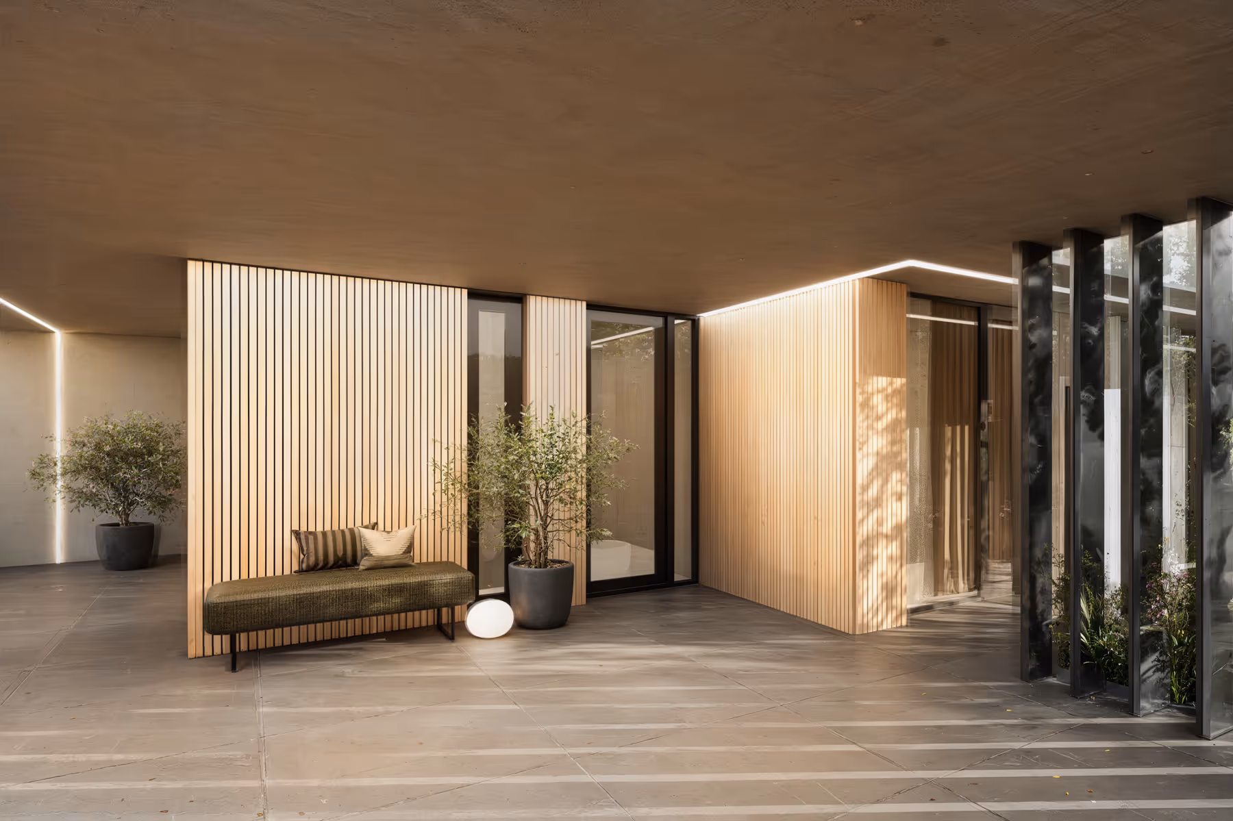Lokalita je charakteristická rodinnými domami na úzkych pozemkoch s dlhými záhradami. Prístup na pozemok a parkovanie sú situované zo severozápadnej strany, zatiaľ čo hlavný vstup do objektu je navrhnutý z juhozápadu. Rovinatosť pozemku umožňuje praktické využitie priestoru. Pred domom sa nachádza priestranné prestrešenie, slúžiace aj ako prístrešok pre autá. Pre vytvorenie súkromia je predzáhradka oddelená oceľovými lamelami, ktoré sú zároveň výrazným architektonickým prvkom. Zadná terasa, orientovaná na juh a západ, ponúka priestor na relax, v blízkosti je bazén a altánok s exteriérovou kuchyňou.