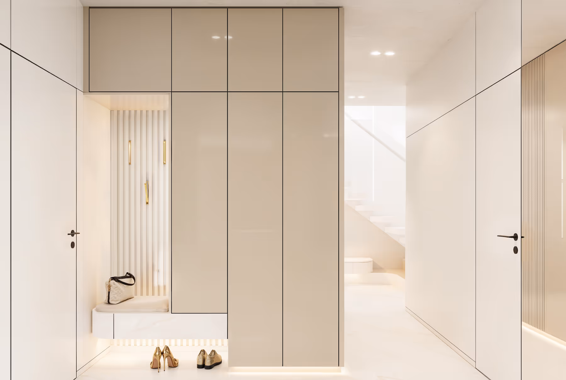 Priestor vstupnej haly obsahuje šatníkovú zostavu, ktorá je súčasťou kubusu pokračujúceho k schodiskovej časti. Do vstupnej haly je prístup z dievčenskej izby a WC.
