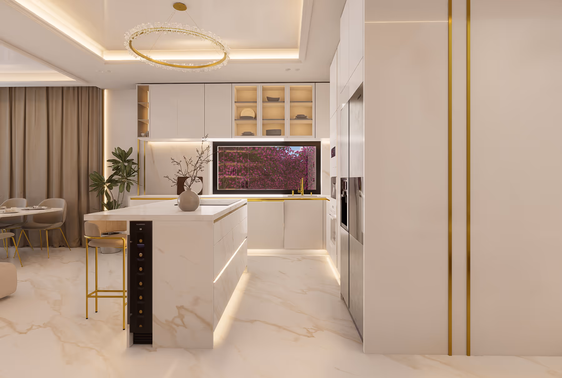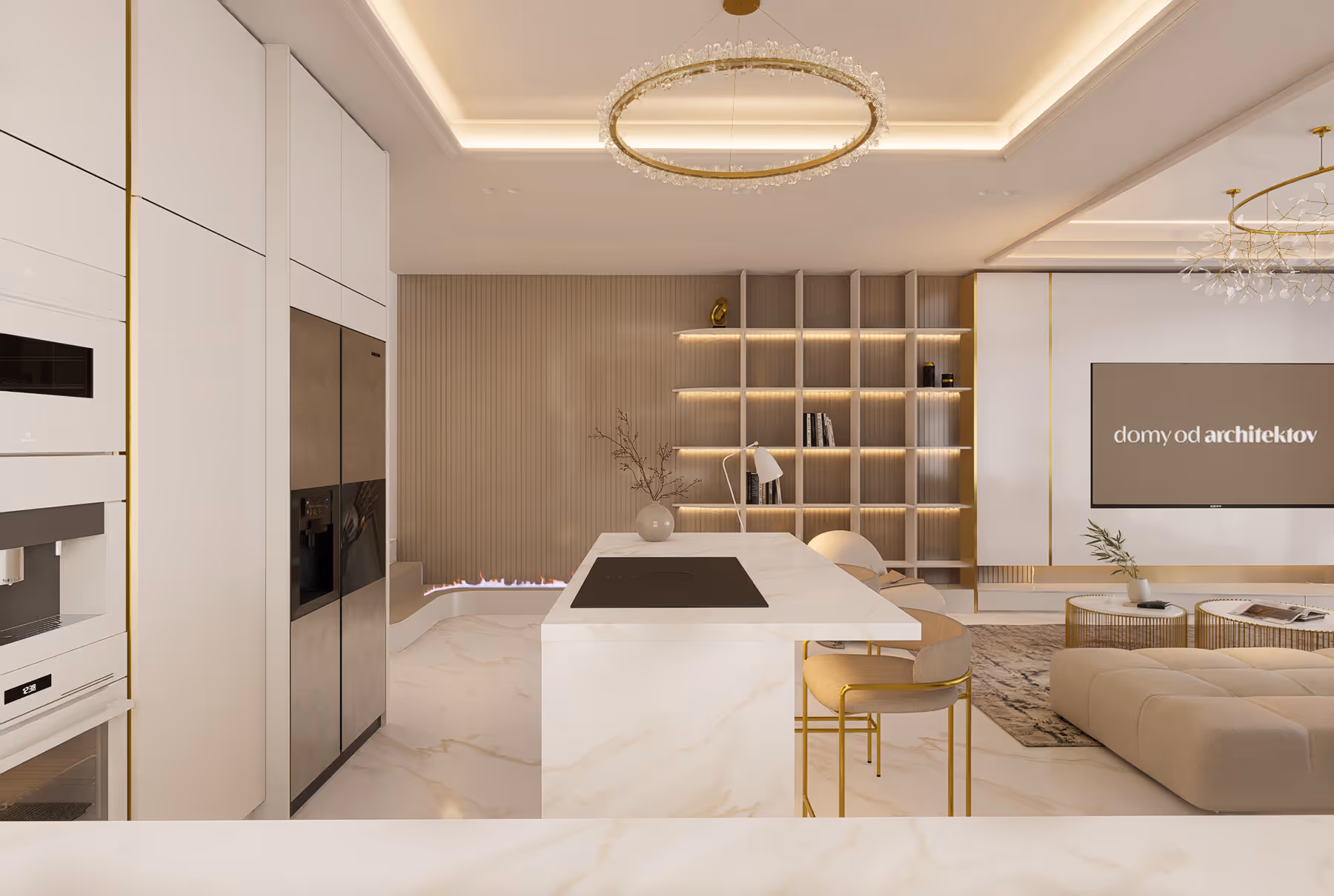 Denná zóna spája kuchyňu, jedáleň a obývačku do harmonického celku. Svetlé tóny béžovej a bielej na kuchynskej linke pôsobia čisto a vzdušne, zatiaľ čo tmavšie, kapučínové lamely na stene za otvorenou knižnicou prinášajú jemný kontrast. Dominantou priestoru je elegantná zaoblená línia biokrbu, plynulo sa vinúca od schodiska až po knižnicu, ktorá dodáva interiéru osobitý charakter. Všeobecne je denná časť ladená do svetlejších tónov, čím pôsobí vzdušne a otvorene, v kontraste s horným poschodím, ktoré si klienti želali v tmavších, intímnejších odtieňoch.