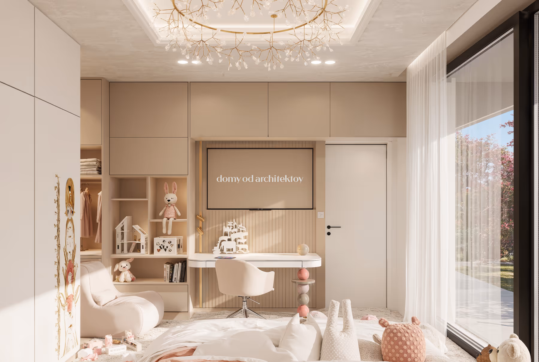 Dievčenská izba v jemných ružových pastelových tónoch spája hravosť s praktickým riešením. Príkladom je výškovo nastaviteľný písací stolík so zaujímavo navrhnutým mechanizmom. Súčasťou izby je otvorený šatník a kúpeľňa s WC, kde dominuje umelý kameň v kombinácii s jemnými béžovými odtieňmi.