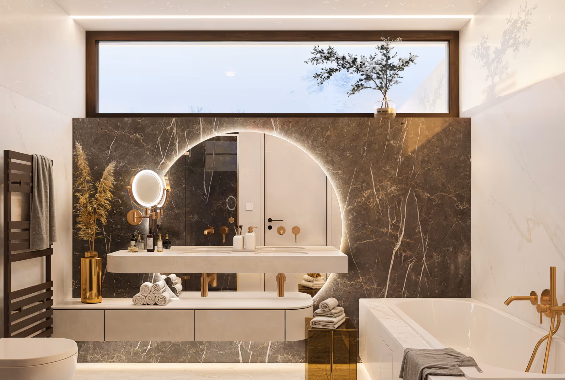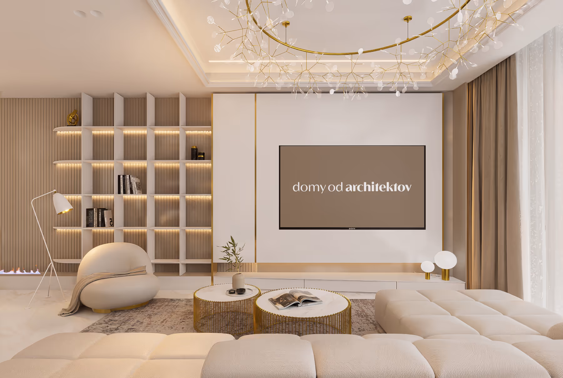 Interiér rodinného domu, navrhnutý ako súčasť modifikovanej dispozície projektu Agát, sa nesie v duchu nadčasovej elegancie. Základom materiálovej palety sú pieskové odtiene tón v tóne, ktoré v spojení so zlatými akcentmi a sofistikovanou imitáciou kameňa vytvárajú luxusný, no zároveň útulný a harmonický domov.