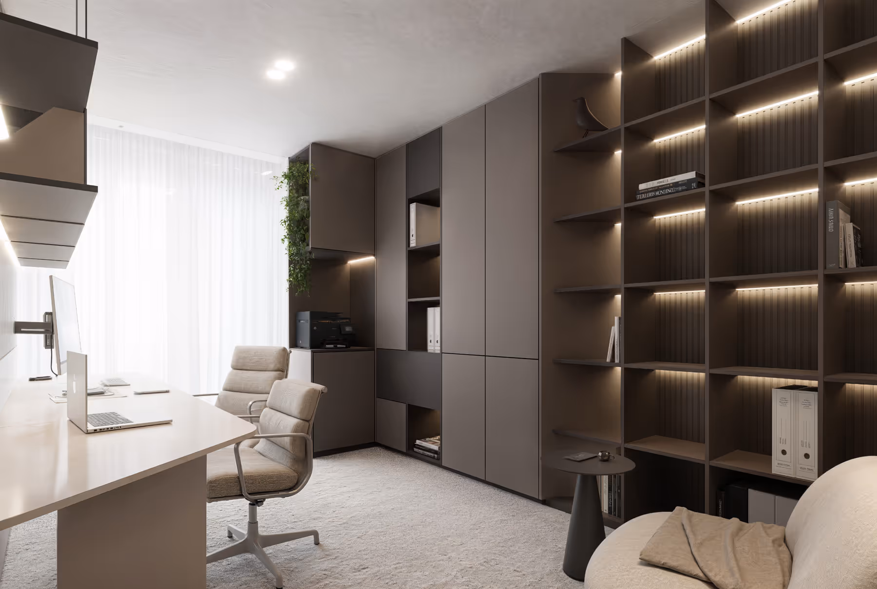 Pracovňa, navrhnutá podľa požiadaviek klienta, je vybavená priestranným písacím stolom pre dvoch a dostatočným množstvom úložného priestoru na dokumenty. Súčasťou pracovne je aj knižnica a pohodlné kreslo určené na čítanie.