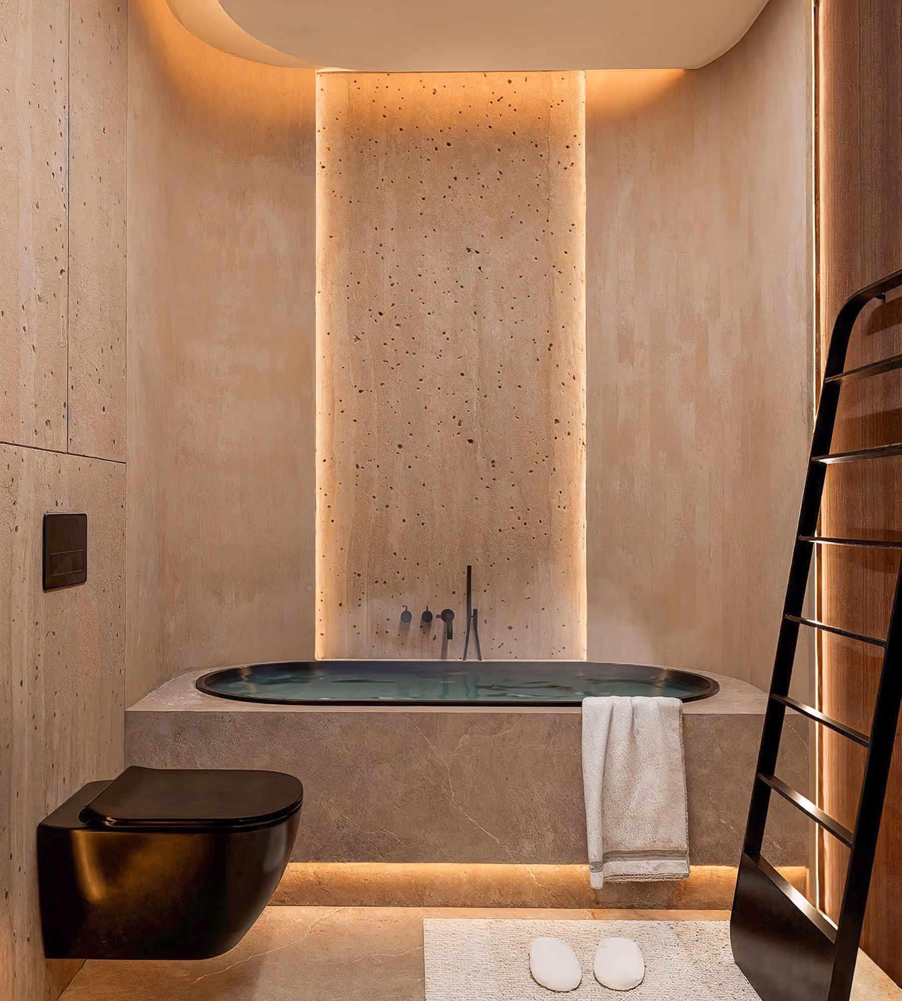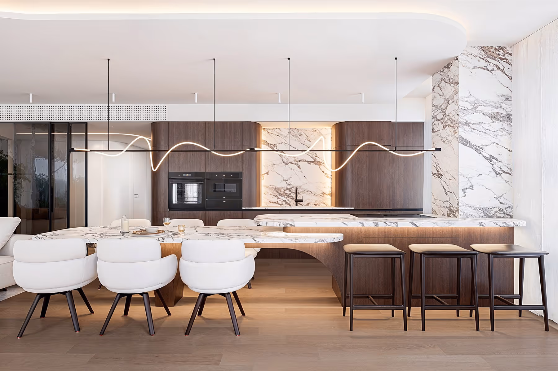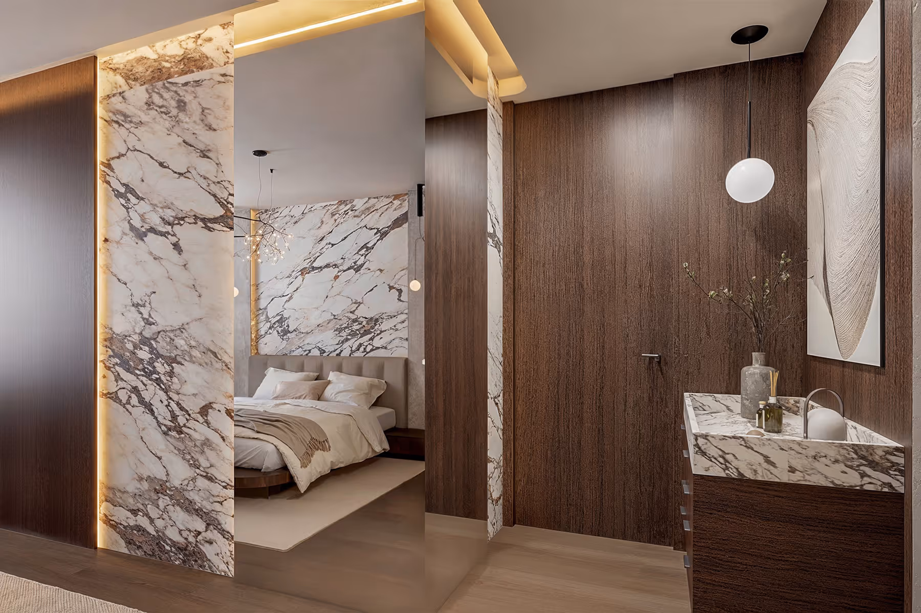 Luxusný interiér v sebe spája eleganciu mramoru, tmavé akcenty a teplo prírodného dreva. Svetlé farebné tóny priestor opticky zväčšujú a dodávajú mu vzdušnosť, zatiaľ čo premyslené detaily a kvalitné materiály podčiarkujú exkluzívny charakter celého priestoru.