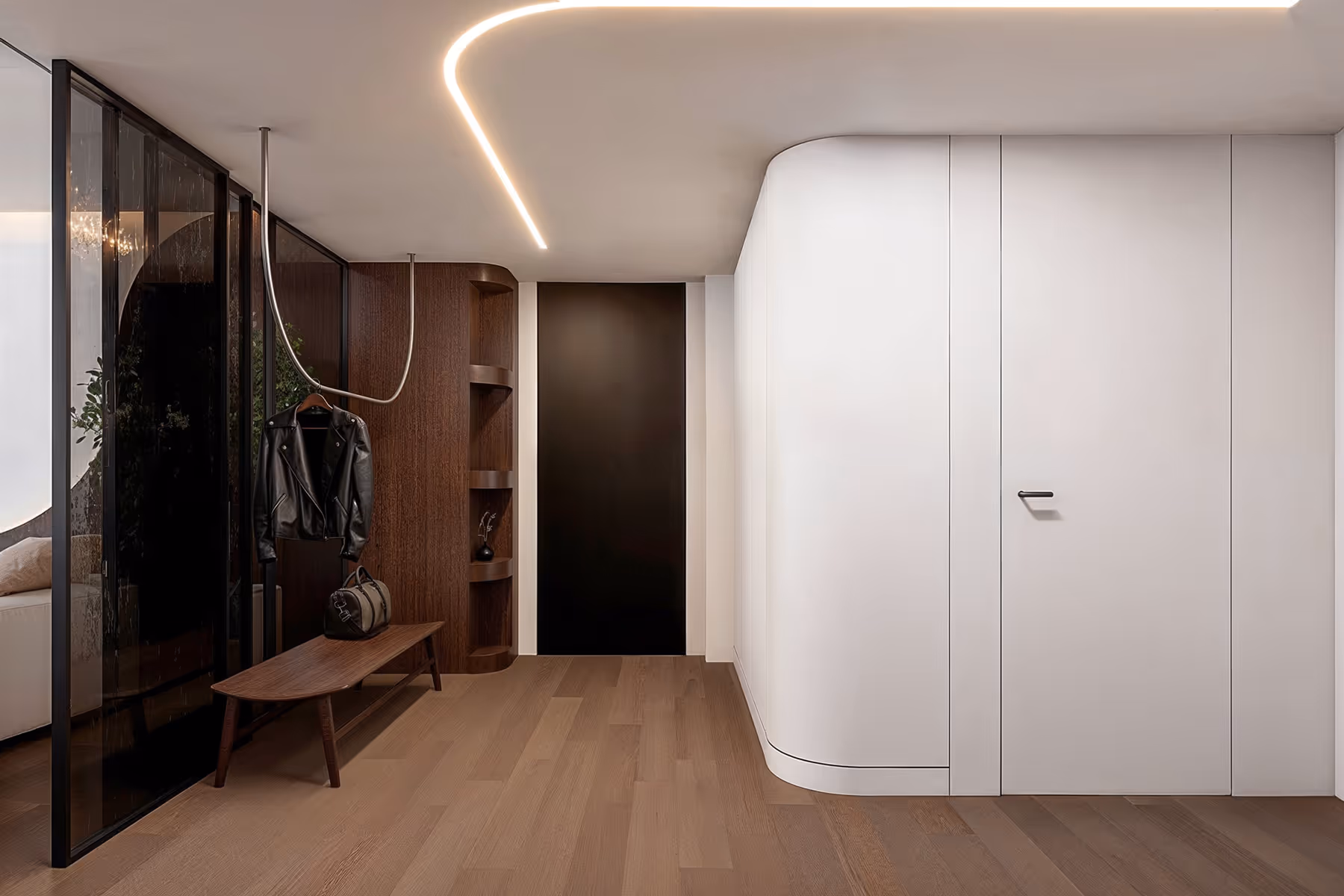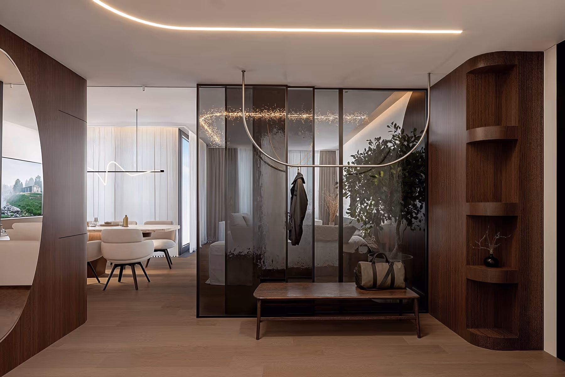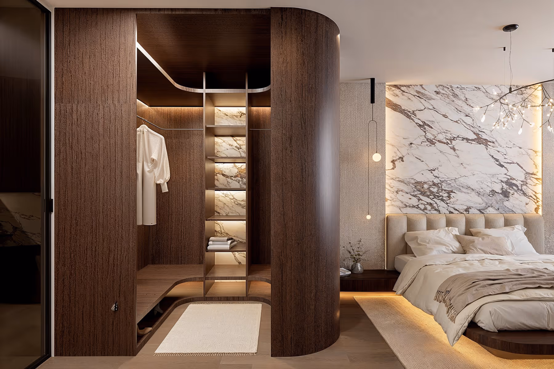 Luxusný interiér v sebe spája eleganciu mramoru, tmavé akcenty a teplo prírodného dreva. Svetlé farebné tóny priestor opticky zväčšujú a dodávajú mu vzdušnosť, zatiaľ čo premyslené detaily a kvalitné materiály podčiarkujú exkluzívny charakter celého priestoru.