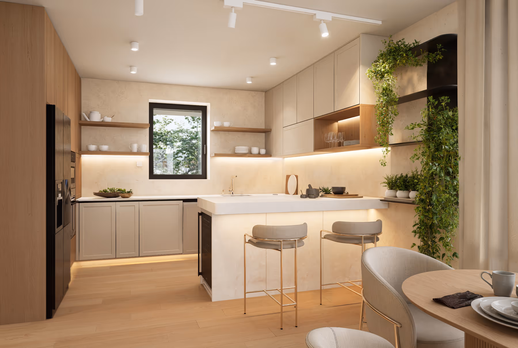 Vďaka okruhovanej dispozícii je kuchynská zóna prístupná priamo zo vstupnej chodby a plynule nadväzuje na jedáleň. Z chodby upúta pozornosť ostrov so vstavanou vinotékou a policová zostava zaplavená všadeprítomnou zeleňou, zatiaľ čo kuchyňa ostáva subtílne ukrytá a jej elegantný dizajn sa naplno odhalí až po vstupe dovnútra.