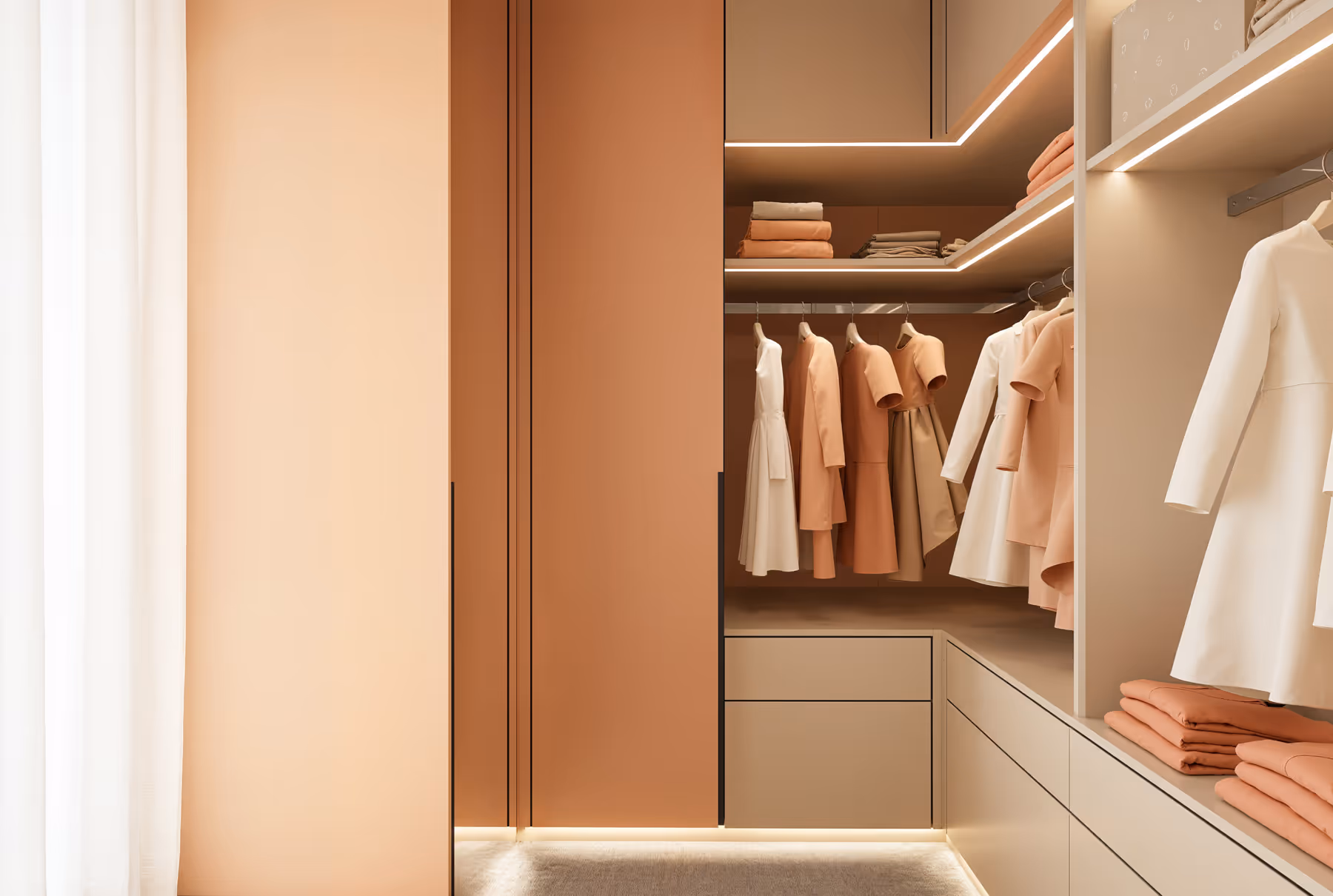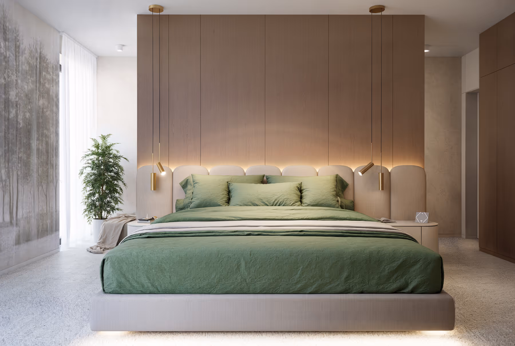 Rodičovská zóna pozostáva zo šatníkovej predsiene, spálne a kúpeľňovej časti. Spálni dominuje výrazná tapeta s prírodným motívom, zatiaľ čo kúpeľňa je ladená v tónoch mikrocementu bez obkladov, pričom tmavší odtieň opticky oddeľuje sprchový kút. Do kúpeľňovej skrinky sú elegantne ukryté - centrálny vysávač, nevyhnutné kozmetické pomôcky a odpadkový kôš.