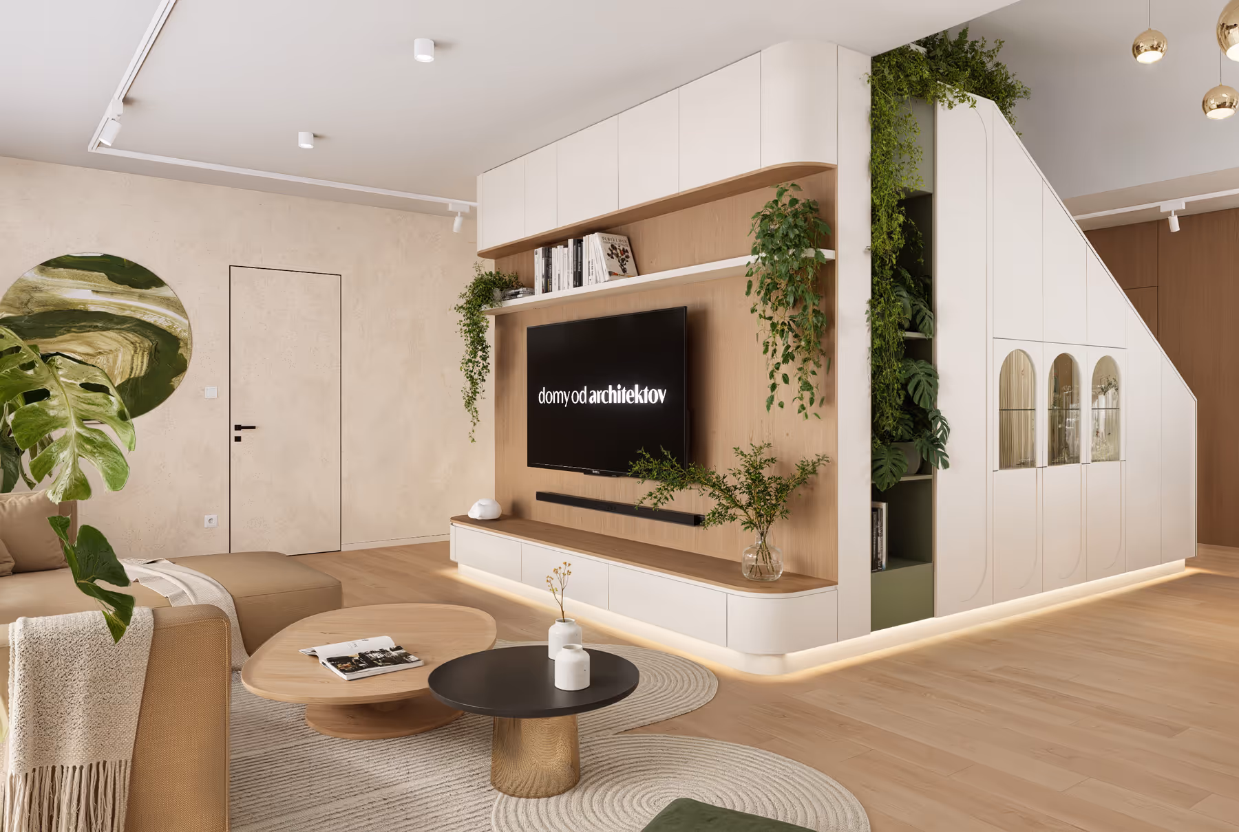 Obývačka vďaka nadštandardným oknám disponuje množstvom denného svetla a priamym prístupom na terasu. Televízna obrazovka je začlenená do centrálneho kubusu a harmonicky lícuje so skrinkami, v ktorých sú uložené multimediálne komponenty. Pozornosť upúta aj akvárium, integrované do nábytkovej zostavy a obklopené zeleňou.