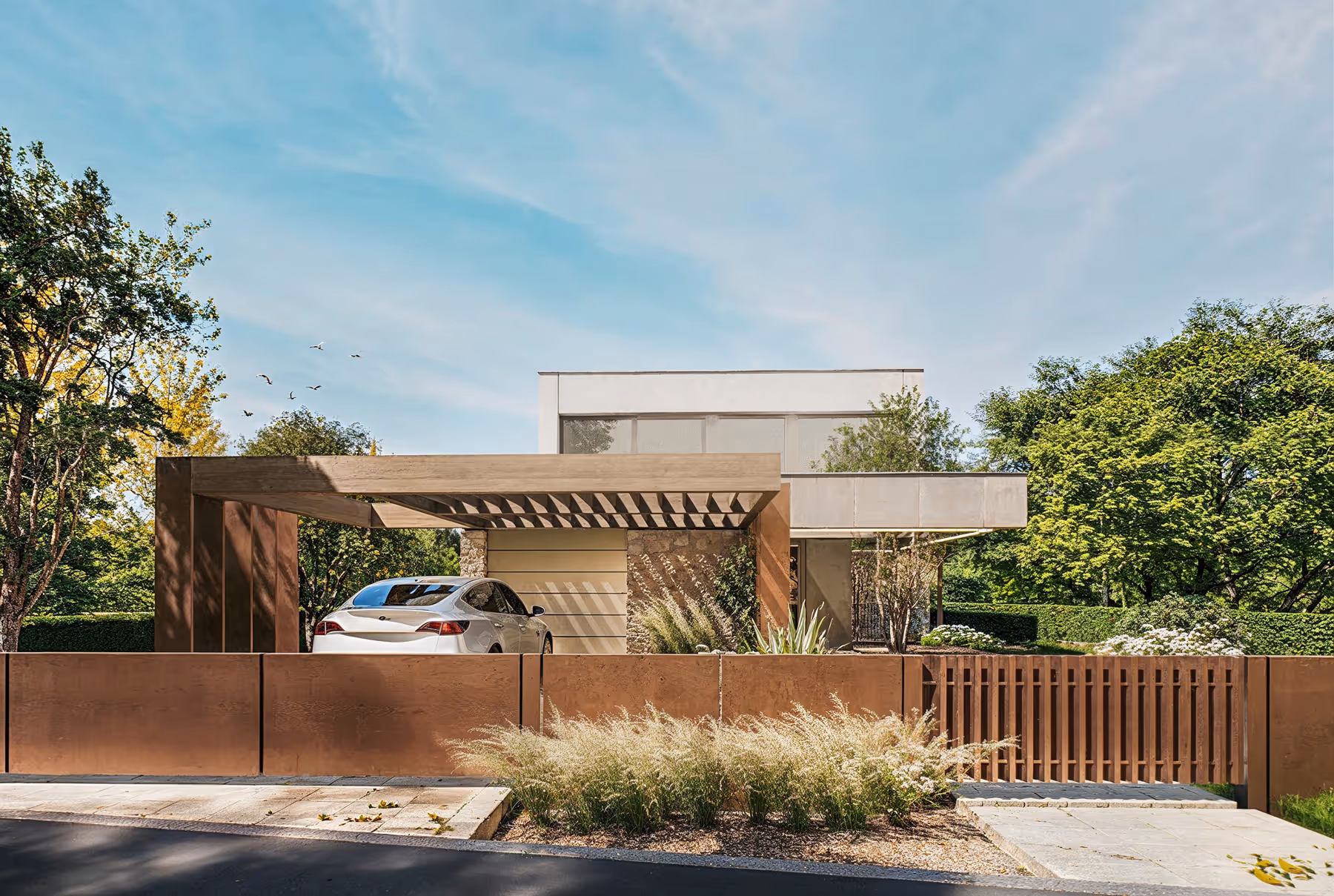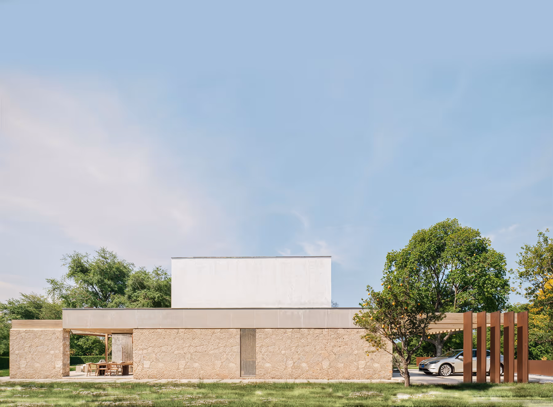 V severovýchodnej časti pozemku stojí dom na kamennej základni, ktorá je podopretá betónovým vencom nad prízemím. Nad ňou je umiestnené ustúpené podlažie, materiálovo odlišné, čo vytvára vizuálnu a funkčnú rozmanitosť jednotlivých podlaží.
