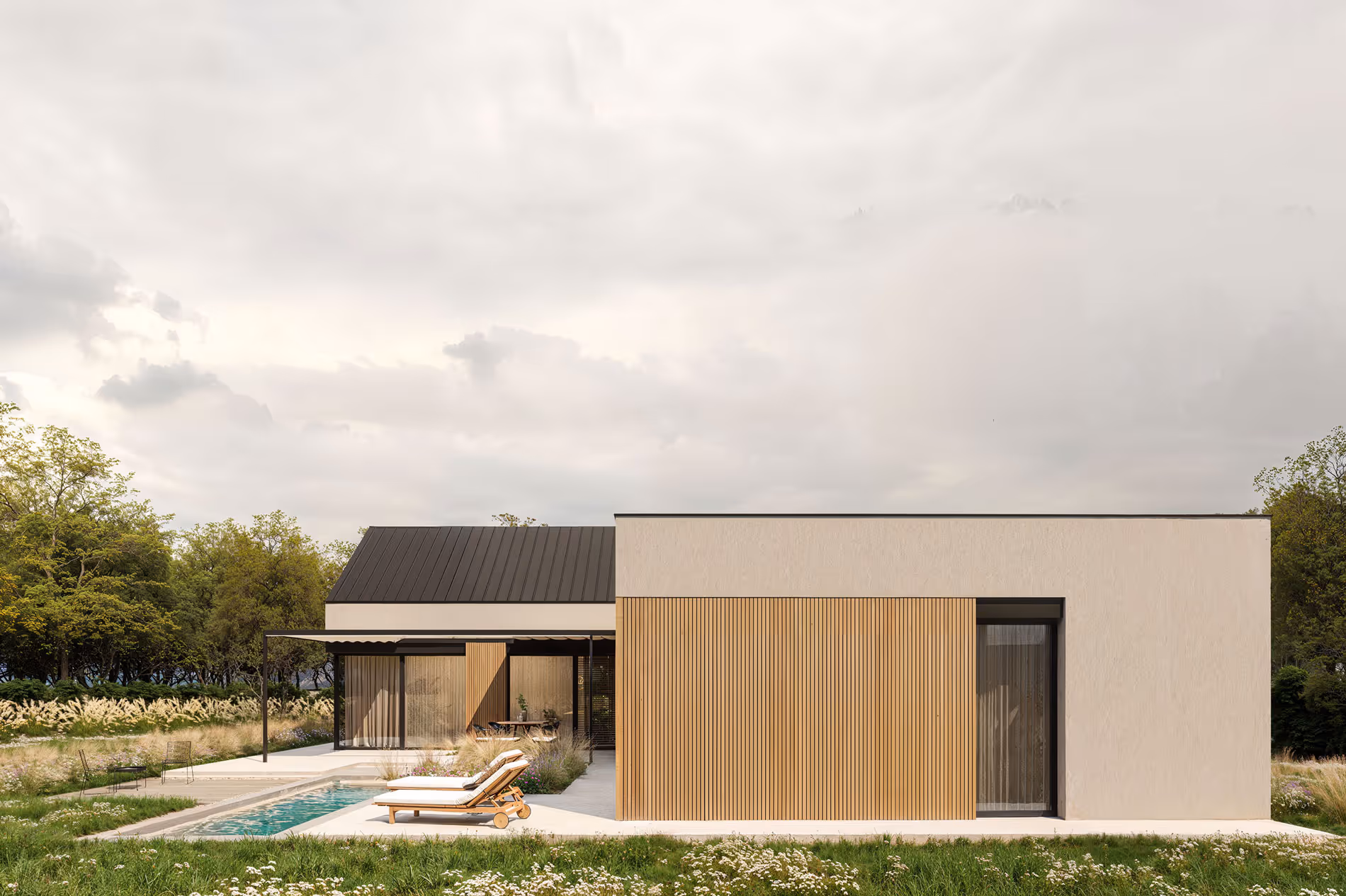 - Privátna nočná časť so spálňovým apartmánom, detskými izbami a prístupom na terasu zo všetkých miestností.