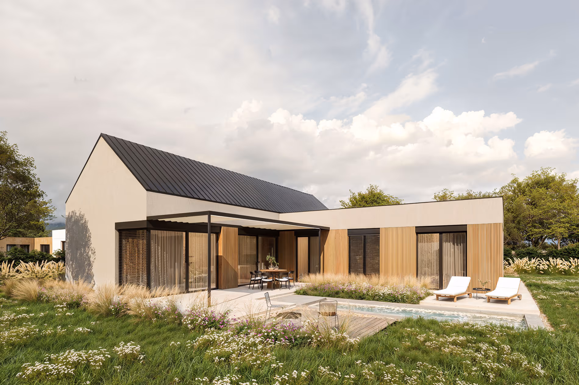 - Dostatok úložného priestoru a dôraz na prepojenie interiéru s exteriérom.