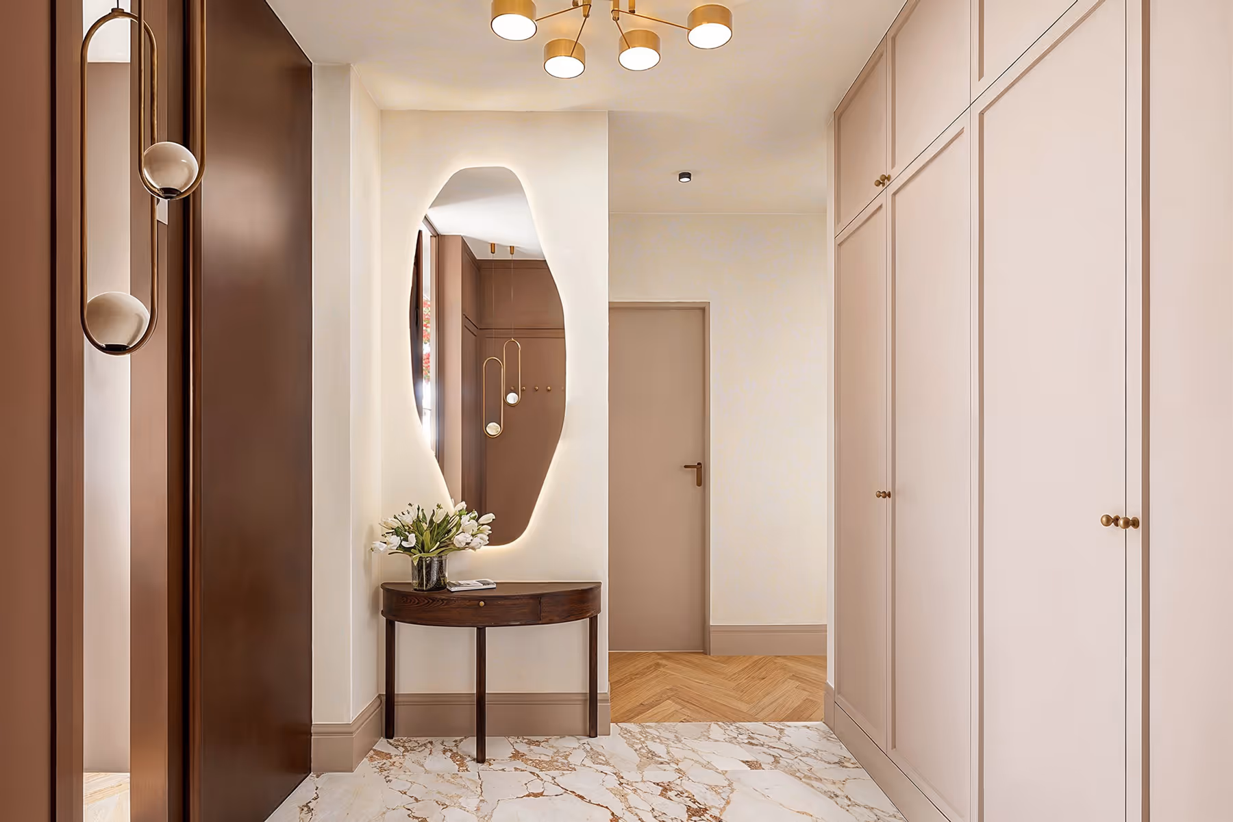 Elegantná, s nádychom vintage, no zároveň nadčasová – taká je atmosféra interiéru ladeného do príjemných zemitých tónov s osviežujúcim mint akcentom. Kombinácia jemnej krémovej, béžovej a kapučínovej farby vytvára teplé, harmonické prostredie s dôrazom na detail a útulnosť. Táto paleta farieb pôsobí prirodzene a vyvážene, zároveň však umožňuje vyniknúť moderným aj retro prvkom. Interiér je navrhnutý tak, aby pôsobil pokojne, esteticky a zároveň funkčne – ideálne miesto pre každodenný život aj výnimočné chvíle.