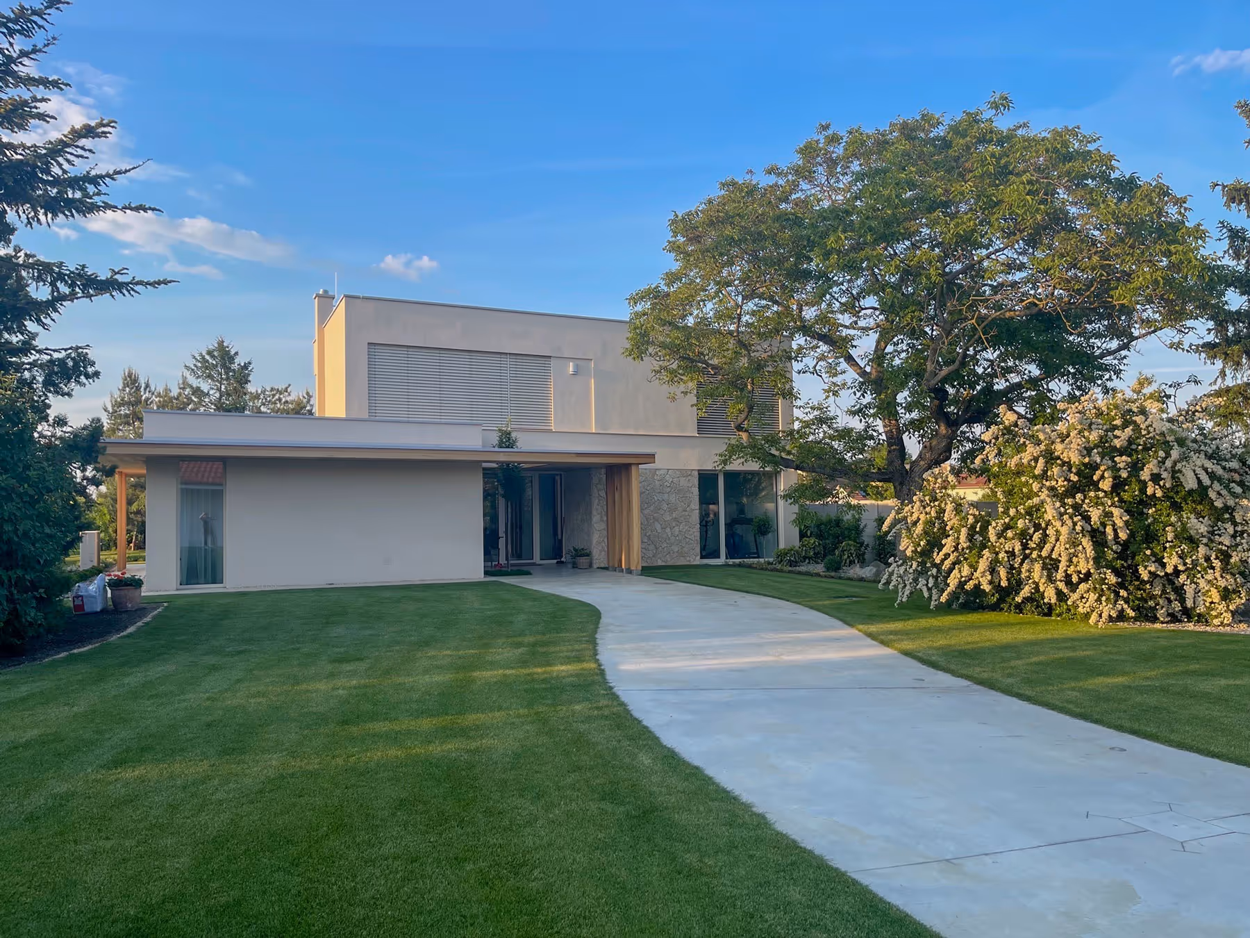 Cieľom návrhu bolo citlivo začleniť rodinný dom do existujúceho prostredia, pričom hlavnou myšlienkou bolo zachovanie pôvodných stromov. Tvar a orientácia pozemku viedli k vytvoreniu dvojpodlažného domu v tvare L. Vďaka tomu, že západný susedný pozemok patrí rovnakej rodine, mohli sme hlavné denné priestory orientovať týmto smerom, čím sa otvára pohľad na privátnu záhradu a maximalizuje sa využitie slnečného svetla.