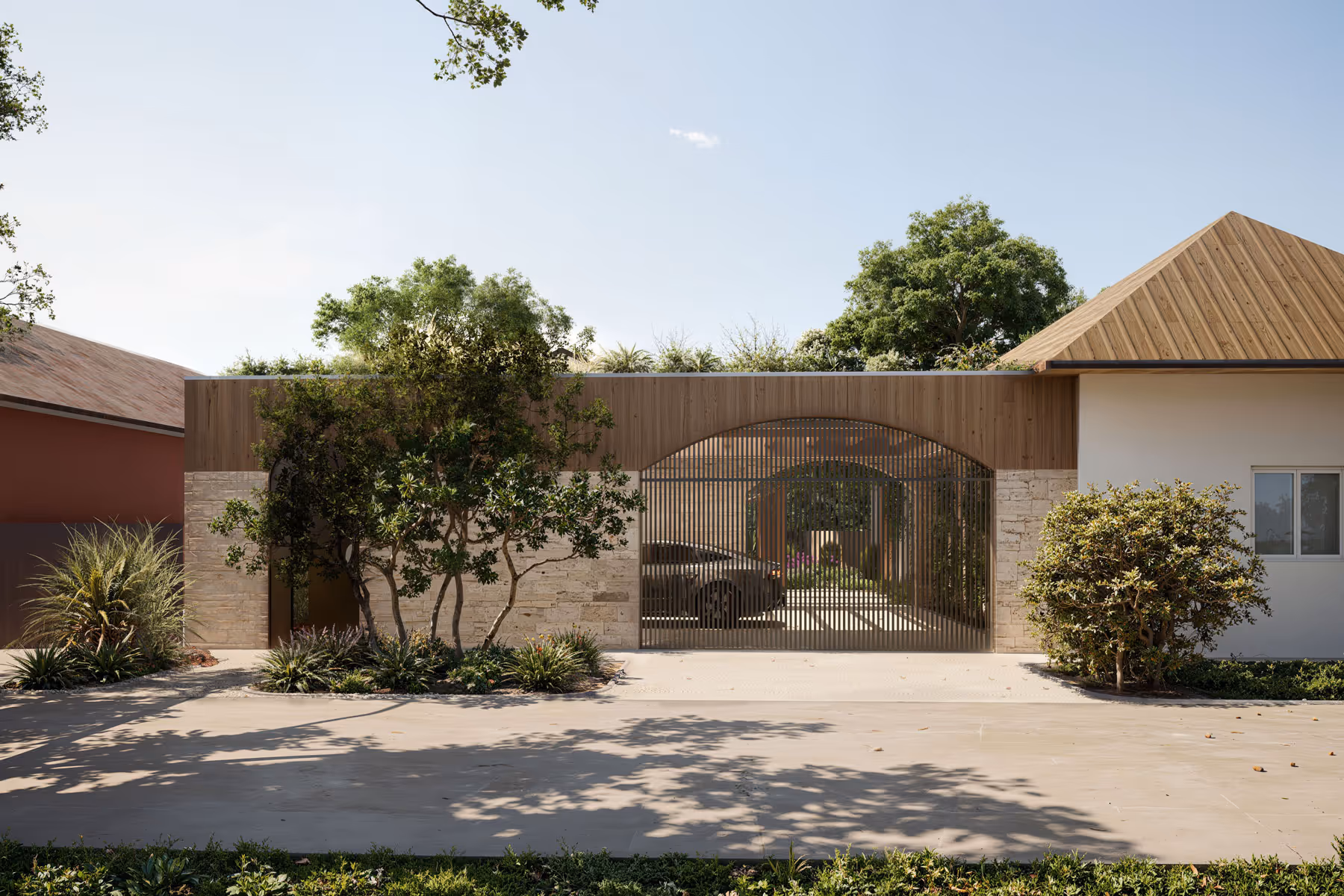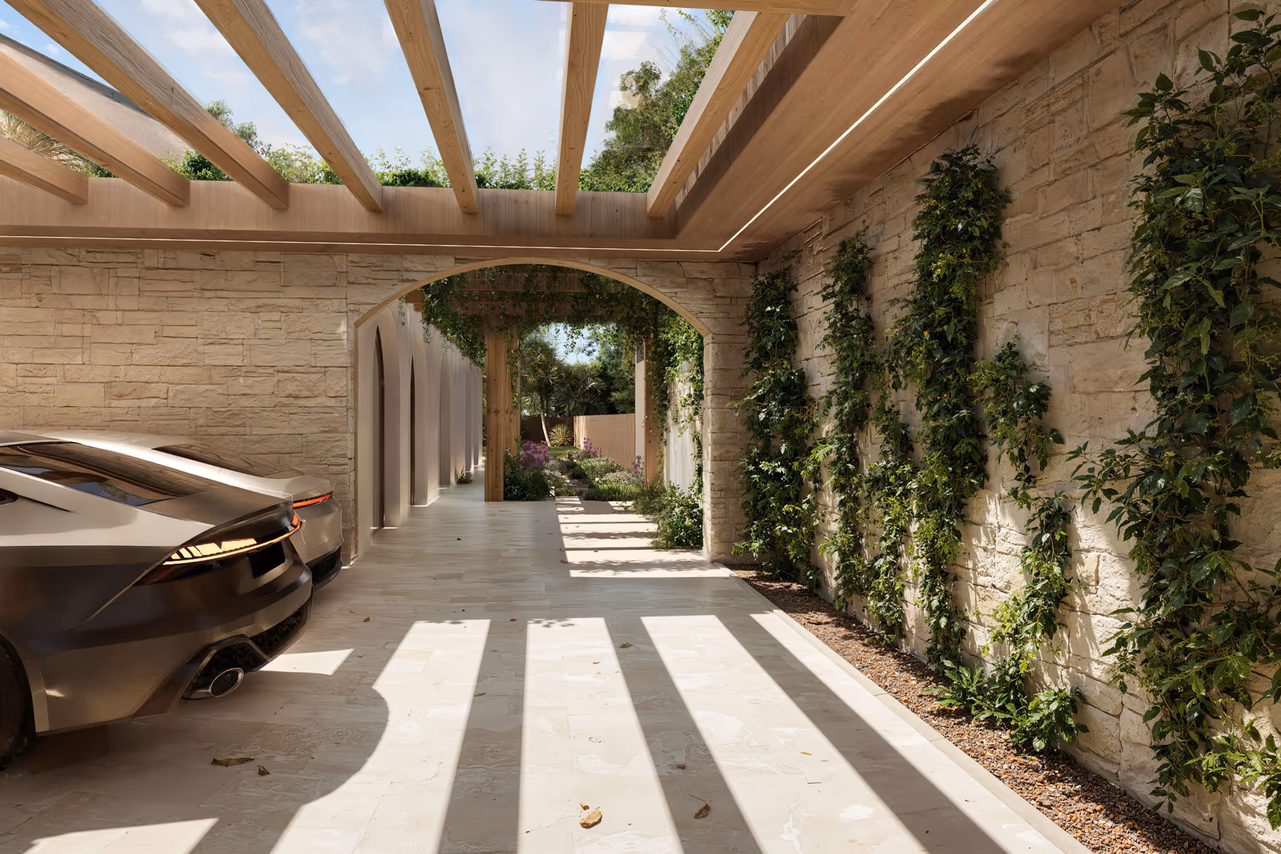 Vstup do domu vedie cez krytý altánok, ktorý zároveň slúži ako prístrešok pre dve autá, čím kombinuje reprezentatívny vstup s praktickým využitím.