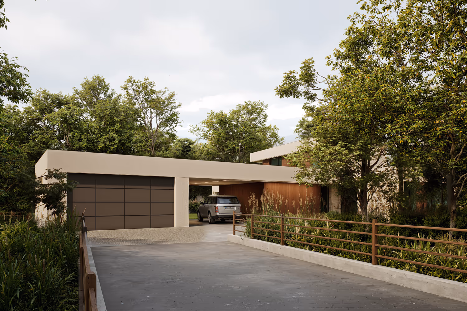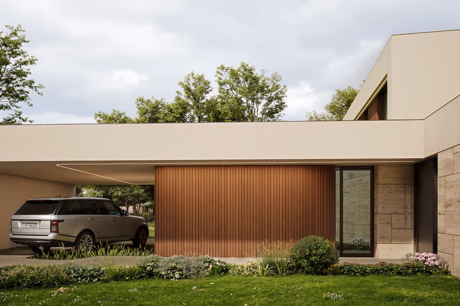 Garáž so skladom je navrhnutá ako samostatný objekt, prepojený s domom prestrešeným prístreškom pre auto. Celá dispozícia podlažia je premyslená s dôrazom na funkčnosť, súkromie a dostatok prirodzeného svetla.