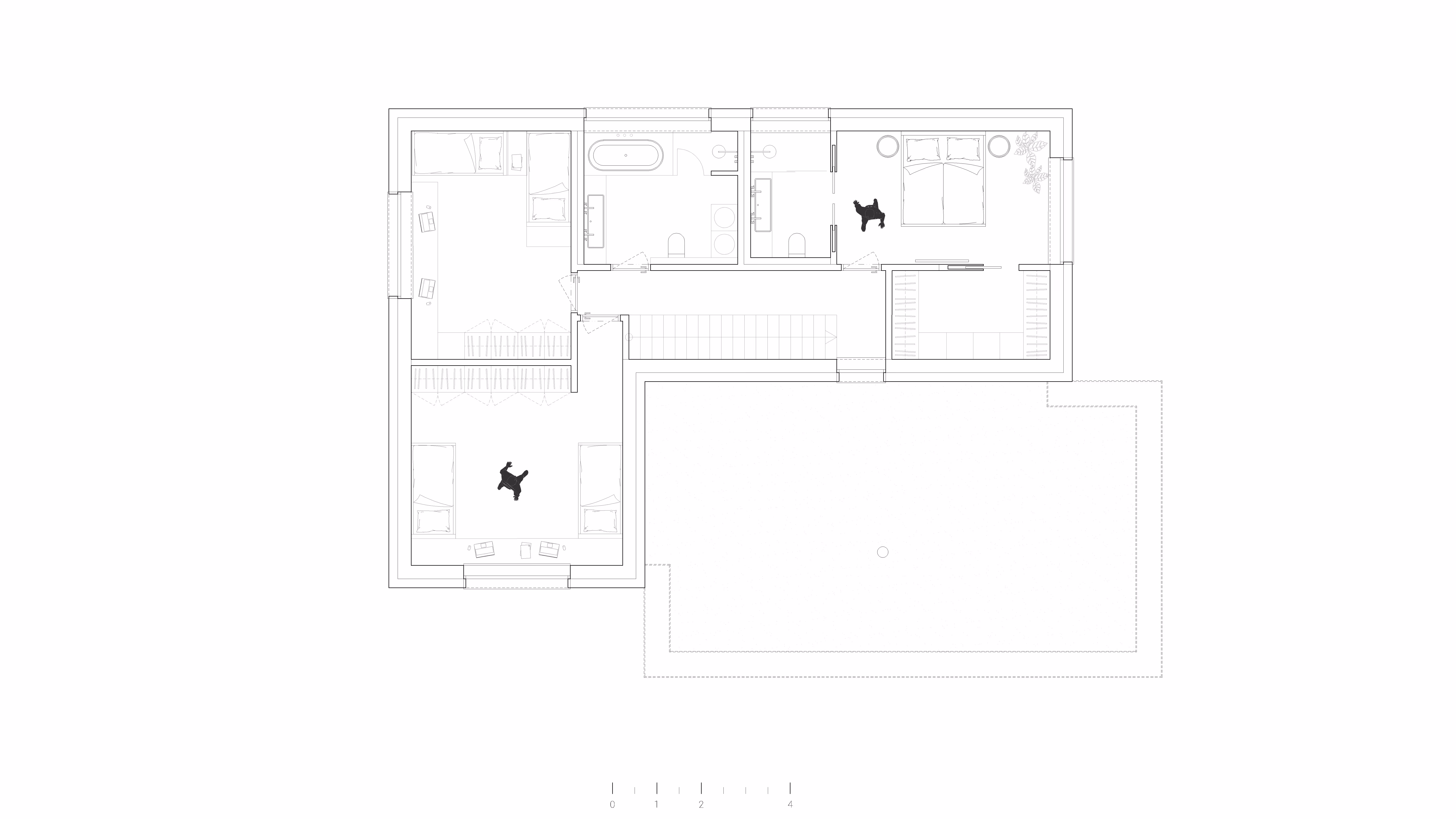 Po jednoramenných schodoch je možné sa dostať na druhé nadzemnépodlažie, kde je navrhnutá súkromná zóna domu. Nachádzajú sa tu dve veľkédvojlôžkové detské izby a kúpeľňa. Taktiež je tu umiestnená rodičovská spálňaso samostatným šatníkom a vlastnou kúpeľňou.