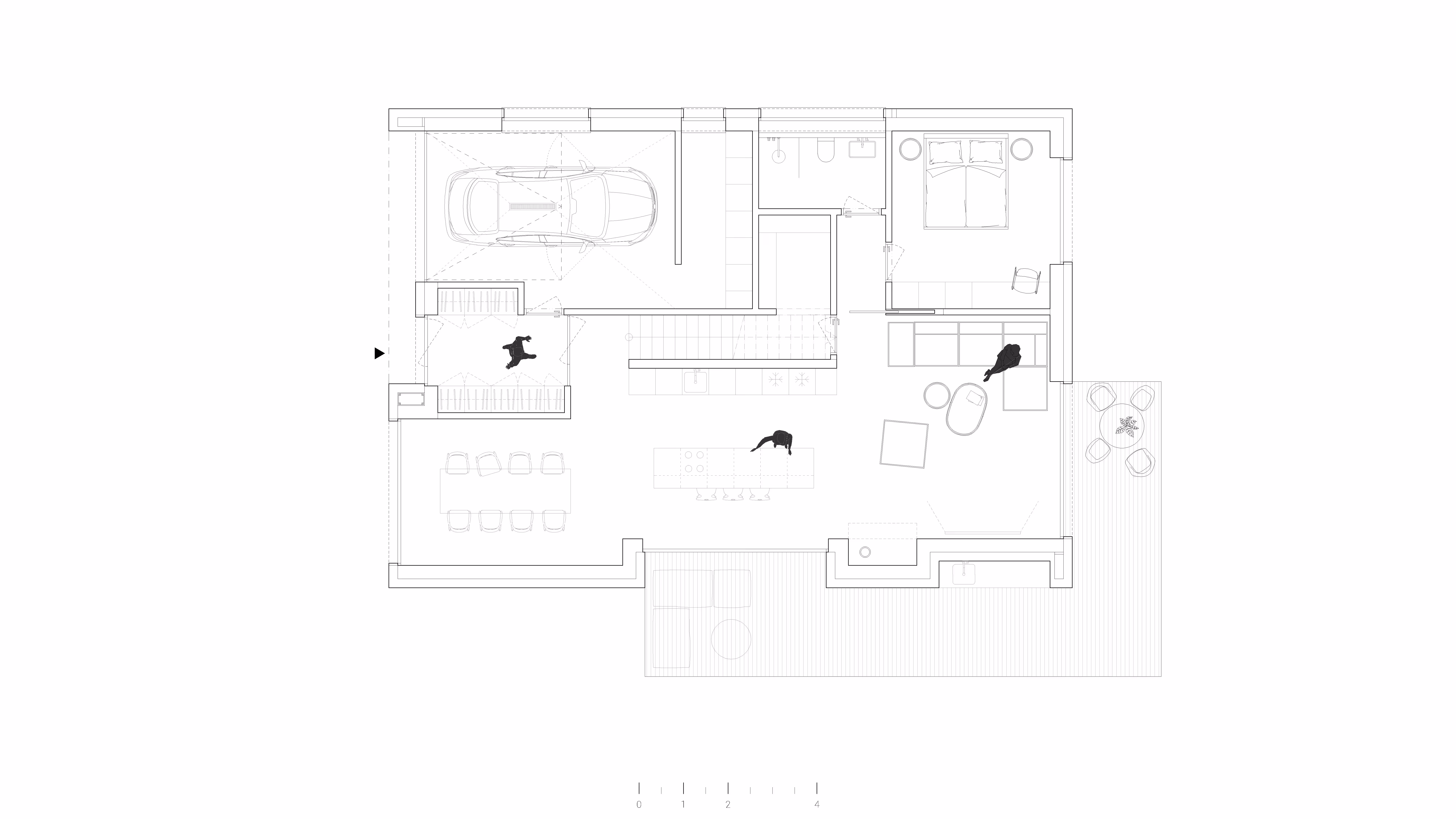 Hlavný vstup je orientovaný v západnej časti pôdorysu, v vstupnejchodbe sa nachádza veľký vstavaný šatník a taktiež vstup do garáže. Zovstupných priestorov sa ďalej otvára priestranná denná zóna a to obývačka,kuchyňa, jedáleň a priestranná prestrešená terasa. Z obývačky sa otvára eštehosťovská izba, kúpeľňa a špajza.