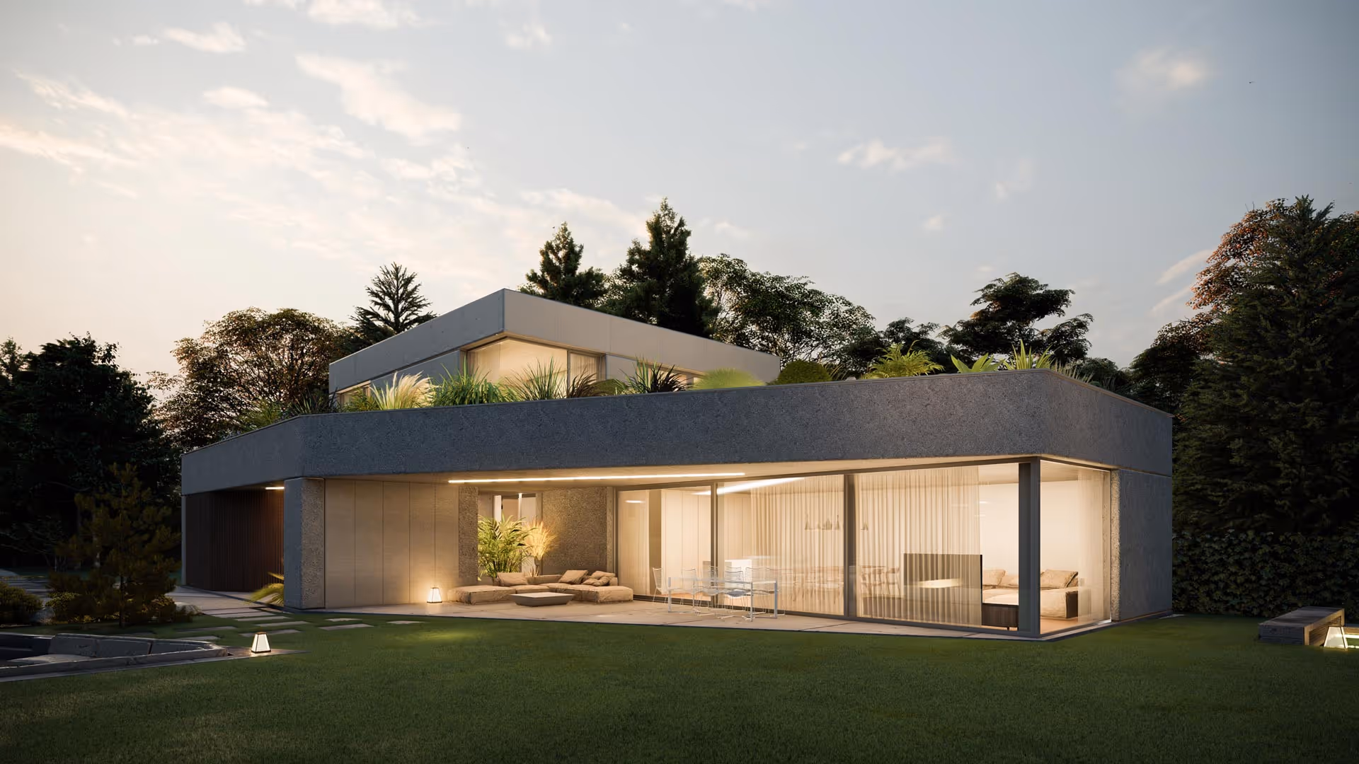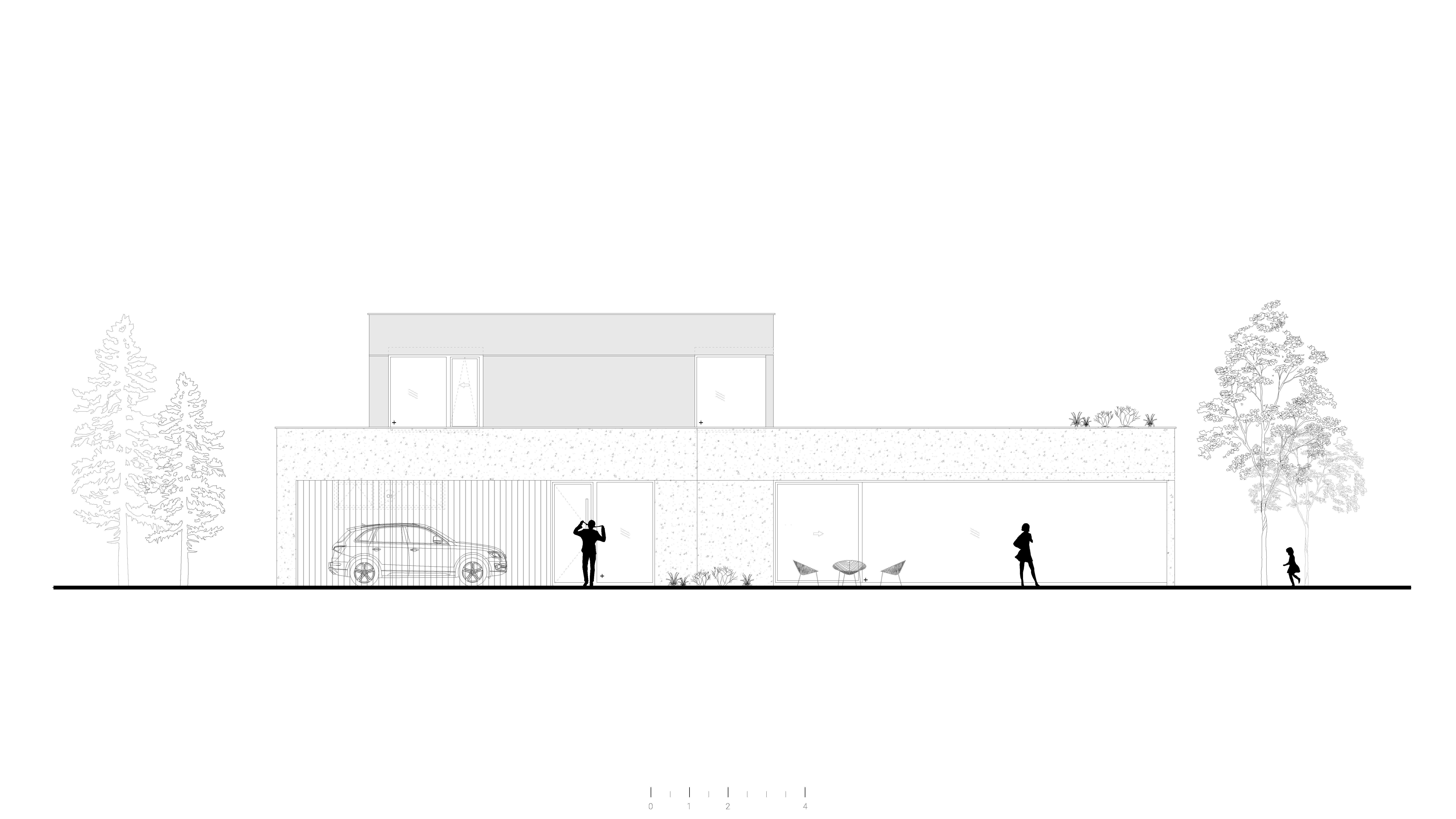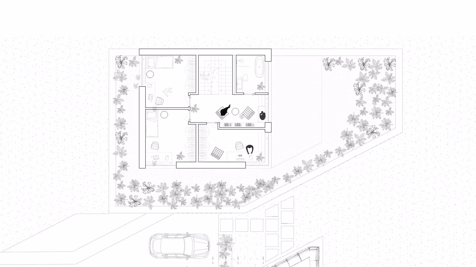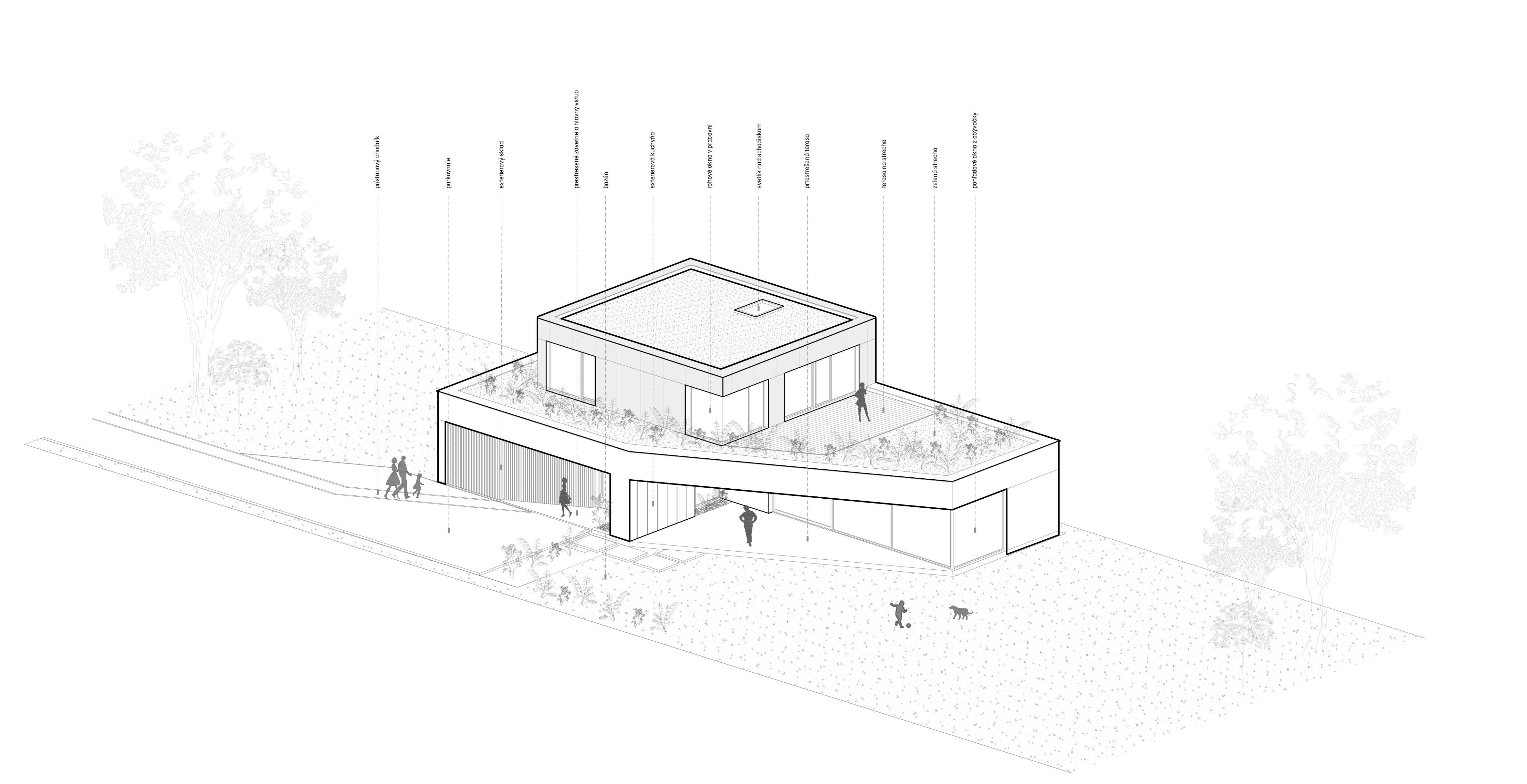 Hlavný vstup do domu je situovaný na južnej strane fasády. Zeleň ktorá prechádza z exteriéru do interiéru cez vstupné priestory až ku schodisku prirodzene prepája záhradu z interiérom domu. Z chodby pomocou pivotových dverí sa vieme dostať do spálňového apartmánu s veľkým preskleným šatníkom a komfortnou kúpeľňou . Denná zóna je dostatočne priestranná na komfortné každodenné bývanie, ale aj väčšie rodinné oslavy. Pomocou veľkých otváravých presklení je možné dennú zónu plynulo prepojiť s veľkou terasou a záhradou .