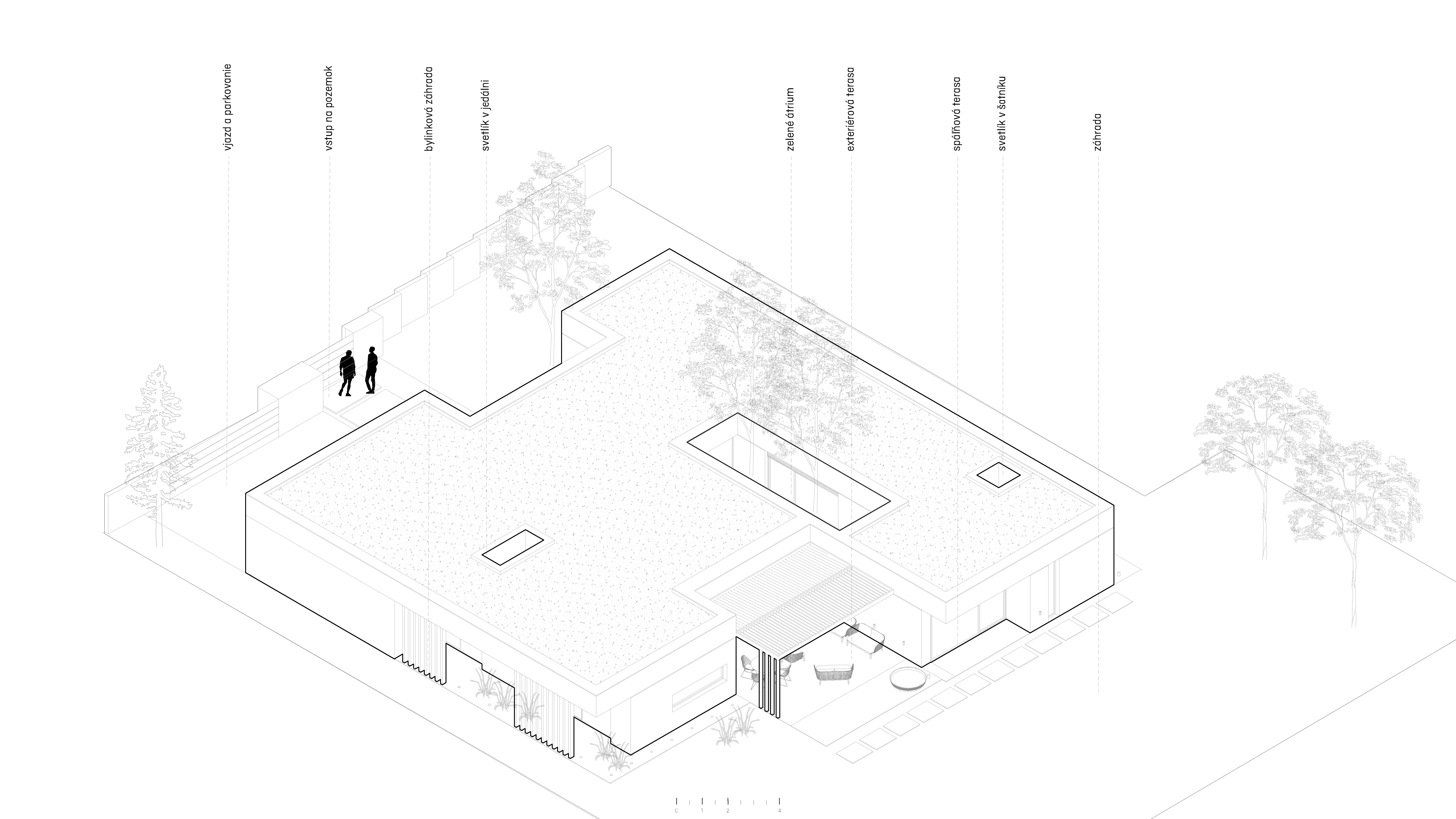 V návrhu rodinného domu sme využili šírku pozemku vzhľadom na komunikáciu a dostali tak väčšinu priestorov pozerajúcich sa priamo do záhrady. Dom je rozčlenený na dennú a nočnú časť, ktoré delí exteriérová terasa vložená do hmoty domu. Dom má rôzne zákutia, ktoré prepája hmota strechy v ktorej sú strešné svetlíky a otvory pre presvetlenie priestorov. Vstupný priestor je vzdušný a plne presvetlený. Nachádza sa tu šatník, WC, priechodná technická miestnosť do garáže. Ďalej vchádzame do komunikácie pozdĺž celého domu. Ideme buď do denných priestorov alebo nočnej časti domu.