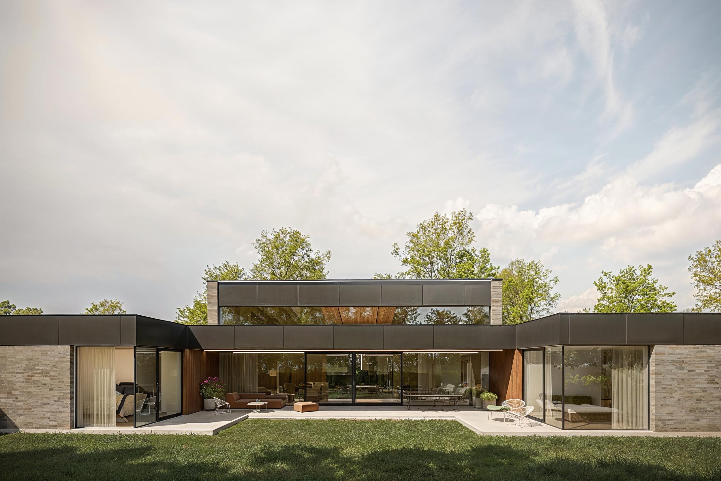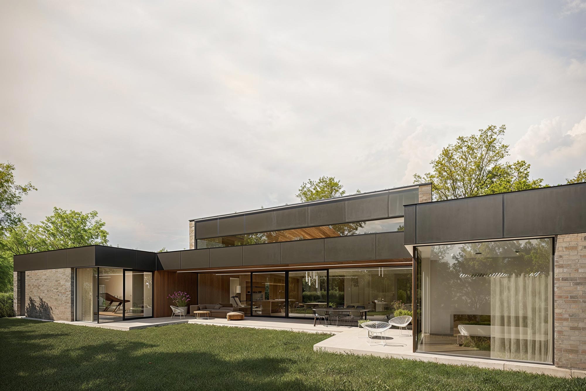 Denná zóna je dobre osvetlená a ponúka výhľad na sever aj juh vďaka veľkým oknám. V západnej časti domu sa nachádza nočná zóna s dvoma detskými izbami, kúpeľňou a pracovňou. Hlavná spálňa s šatníkom a kúpeľňou je oddelená a ponúka výhľad na východ a sever.